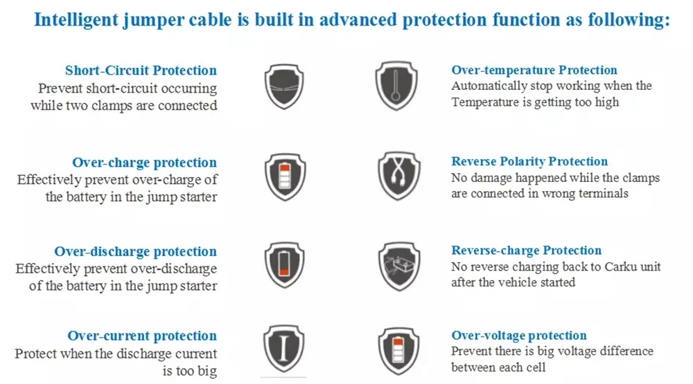 Зажимы для аккумуляторов имеют несколько защитных свойств, чтобы сделать Запуск скачка более безопасным для оператора и запуска транспортного средства, Предлагаем защиту от обратной полярности, перегрузки по току, короткого замыкания, перегрузки, перенапряжения и защиты от избыточной зарядки, что обеспечивает безопасность и простоту в использовании.