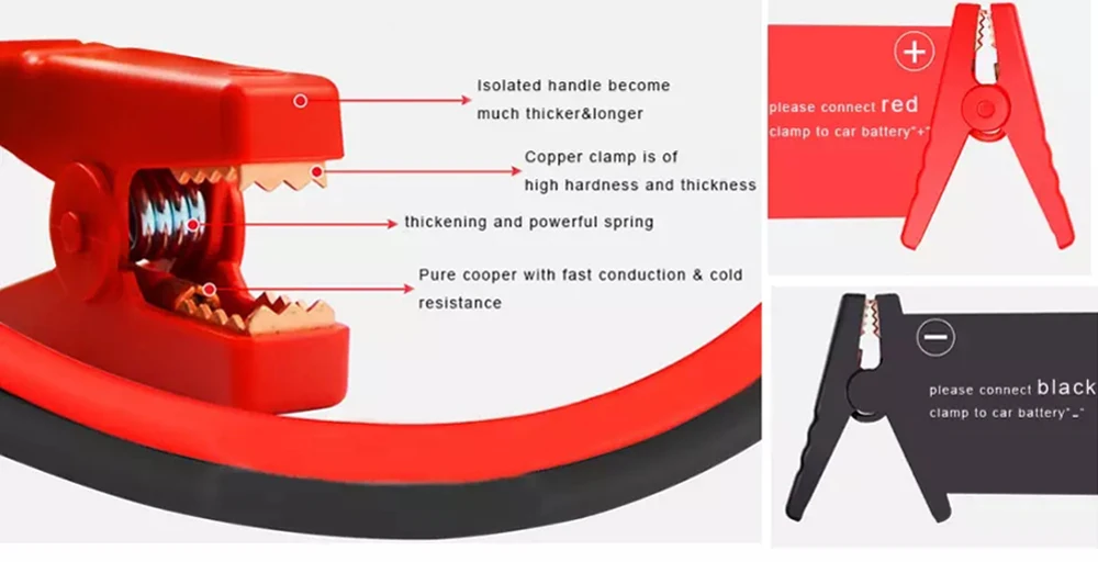 Зажимы для аккумуляторов имеют несколько защитных свойств, чтобы сделать Запуск скачка более безопасным для оператора и запуска транспортного средства, Предлагаем защиту от обратной полярности, перегрузки по току, короткого замыкания, перегрузки, перенапряжения и защиты от избыточной зарядки, что обеспечивает безопасность и простоту в использовании.