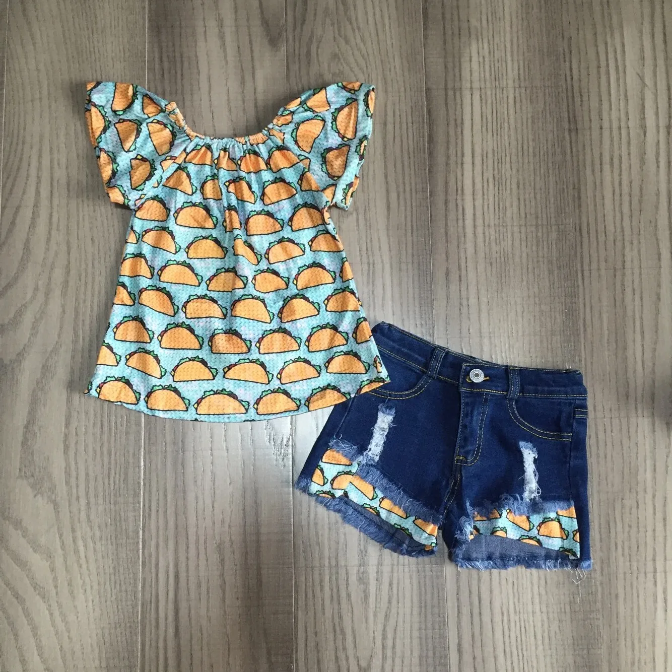 ОписаниеGirlymax/Летняя одежда с короткими рукавами для маленьких девочек; Эксклюзивные джинсовые шорты с принтом Taco; Комплект одежды; Детская одежда