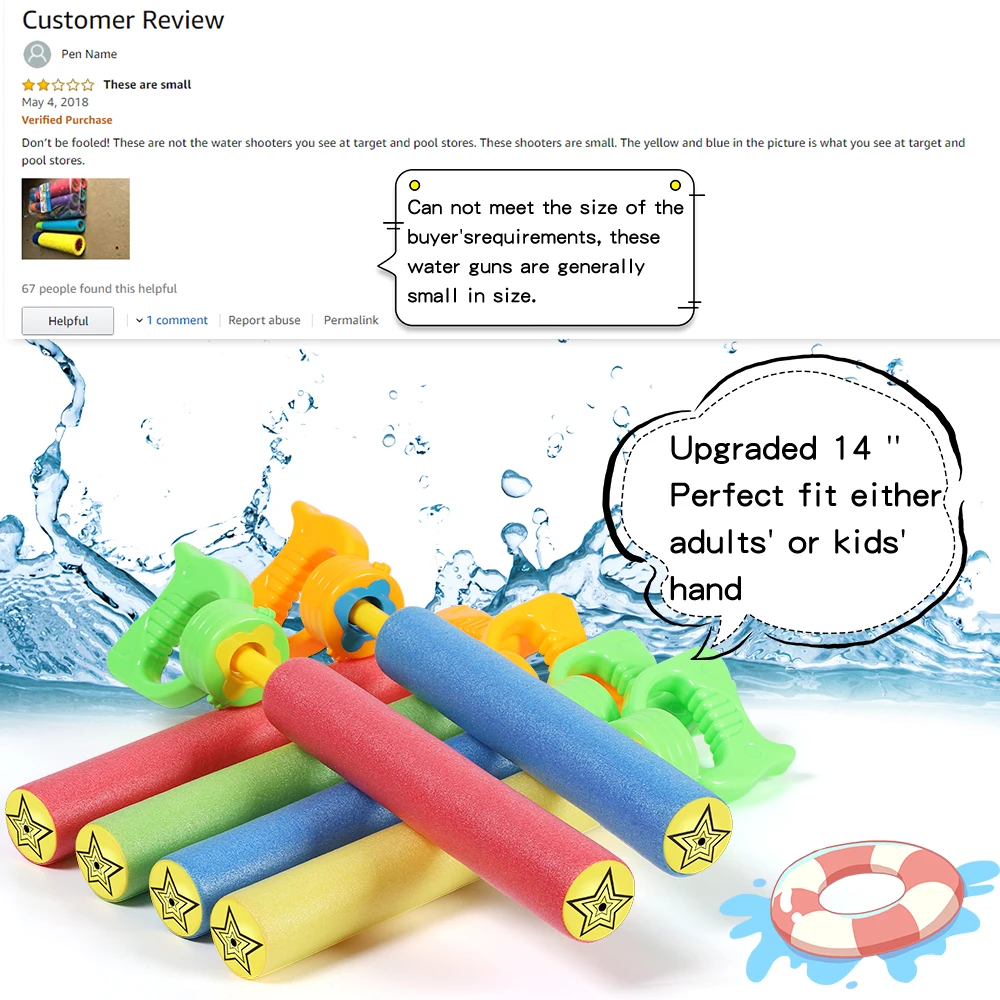 ✅ Includes 6 PCS colorful foam water blaster, each squirt gun size is13.2 '' / 14.6'' (up to 23.6'' when stretched).