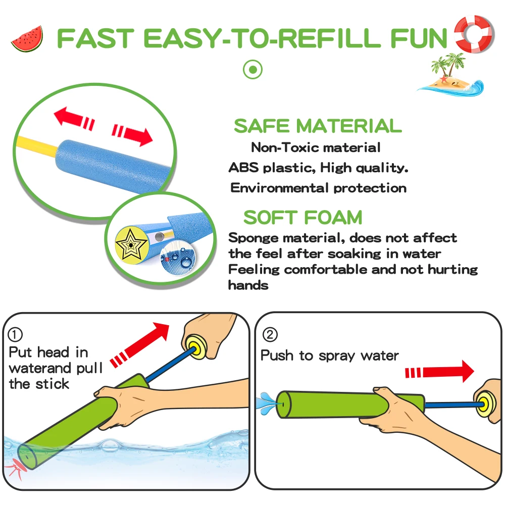 ✅ Safety & High-Quality Foam Water Blaster - We insist on using environmentally-friendly ABS and foam materials, odorless, and the foam material feels softer, which will not hurt the delicate skin of children.