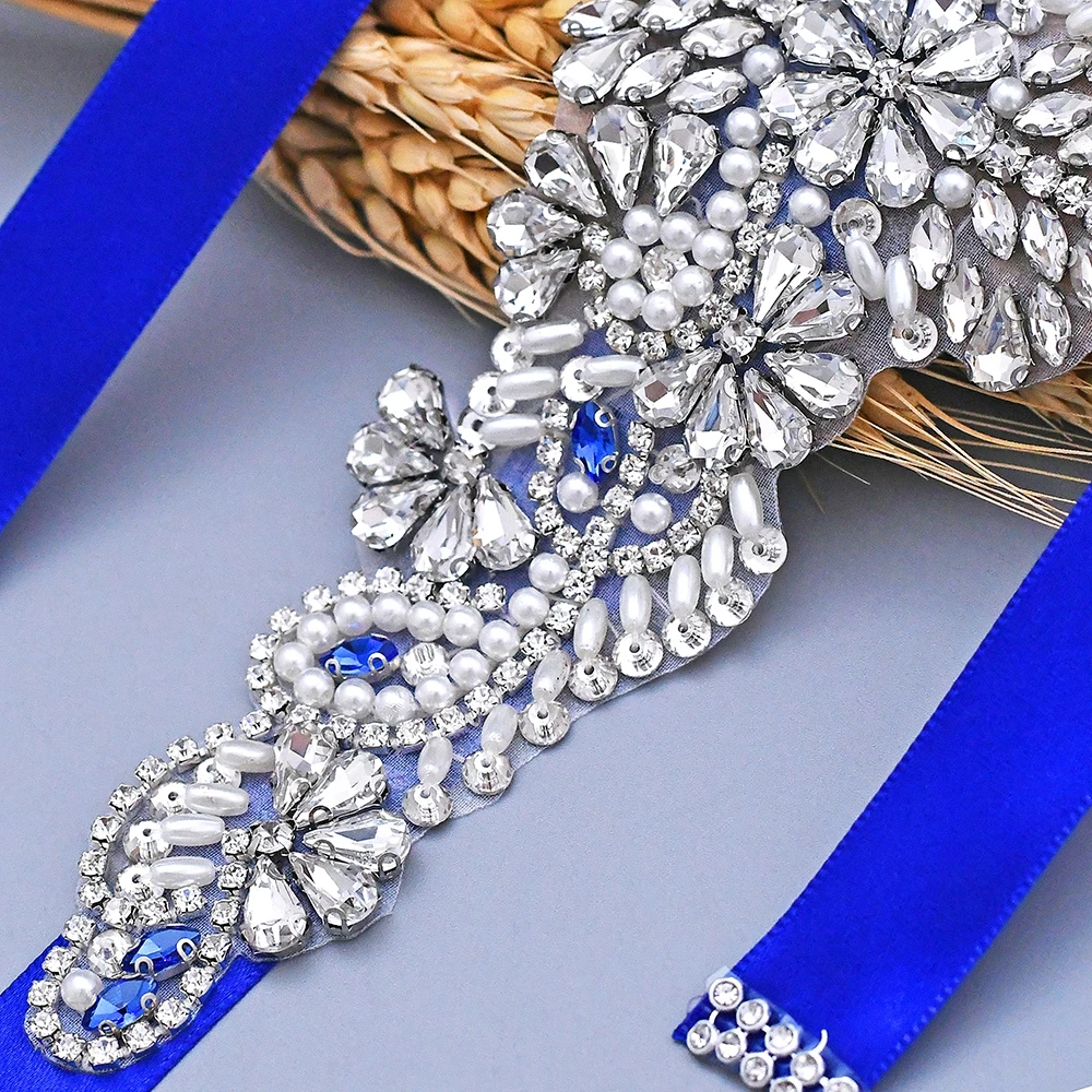 S487 ручная работа, Синие стразы, пояс для невесты, роскошные свадебные аксессуары для девочек, одежда для выпускного вечера, платье, ювелирный пояс, разноцветная лента