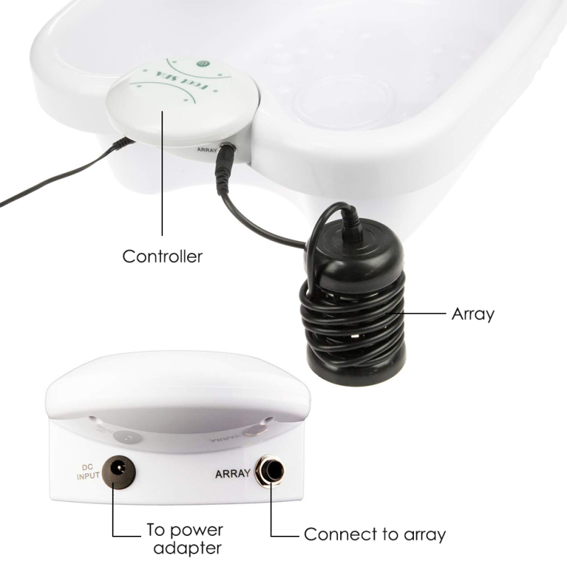 【EASY TO USE】: Really easy to use, just connect to power, press the power button on the controller for 2 times, put a array and your feet into water with a little salt, the machine will work