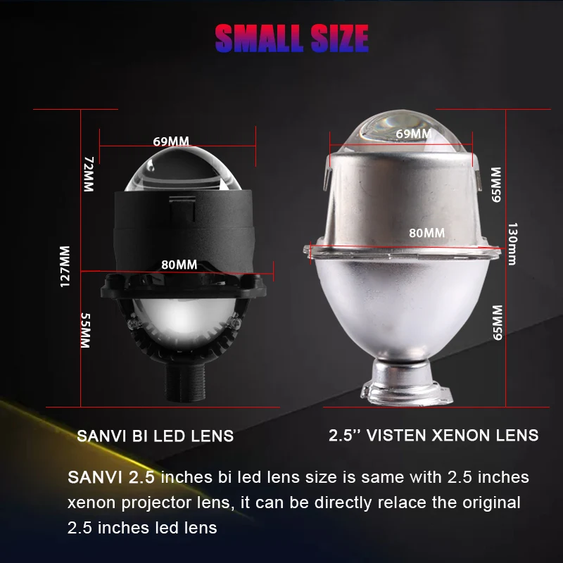 Режим товара: Sanvi S8 Bi светодиодный проектор Размер изделия: 2,5 дюйма Напряжение: 35 Вт Цветовая температура: 6000K Рабочая температура:-40 ℃-+ 85 ℃ Люмен: 4500Lux Срок службы: 30000 часов Гарантия: 12 месяцев Применимость: Цоколь h4 h7 9005 9006 Гарантия: 12 месяцев. Характеристики Товара: Меньший размер: диаметр объектива составляет 69 мм, длина всего 127 мм, это то же самое, что и автомобильные оригинальные линзы проектора visteon HID. Подходит для большинства транспортных средств Супер яркий: чипы 6g, мощность 35 Вт 6000K 4060lux, холодный белый свет. Мгновсветильник, не задерживается. Неразрушающее Крепление: используется конструкция в форме ромба, с крепежными аксессуарами h4 h7 9005 9005, может непосредственно заменить оригинальные галогенные или ксеноновые линзы проектора. Не нужно менять отражатели фар автомобиля. С версиями RHD и LHD: есть версии RHD и LHD, он подходит для правостороннего вождения и левостороннего вождения дороги.