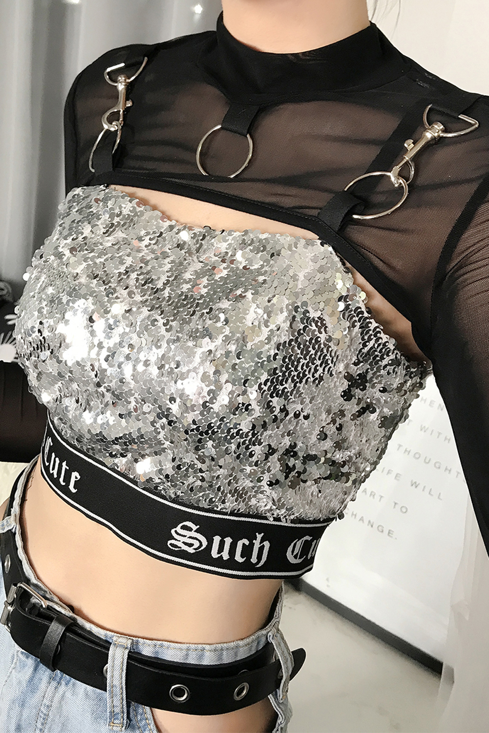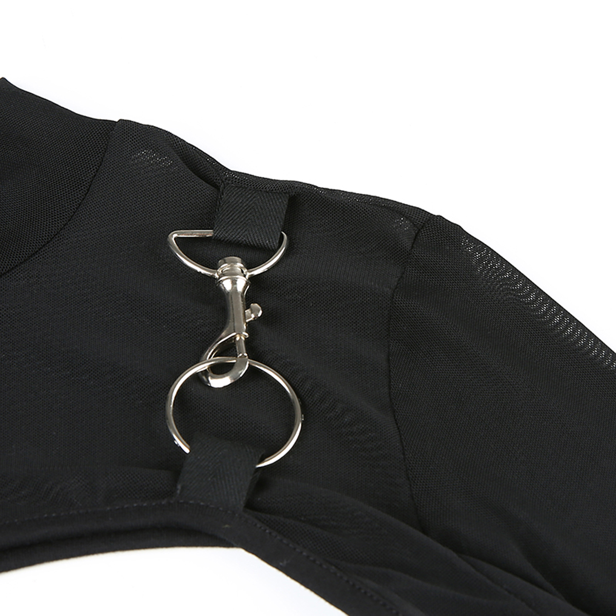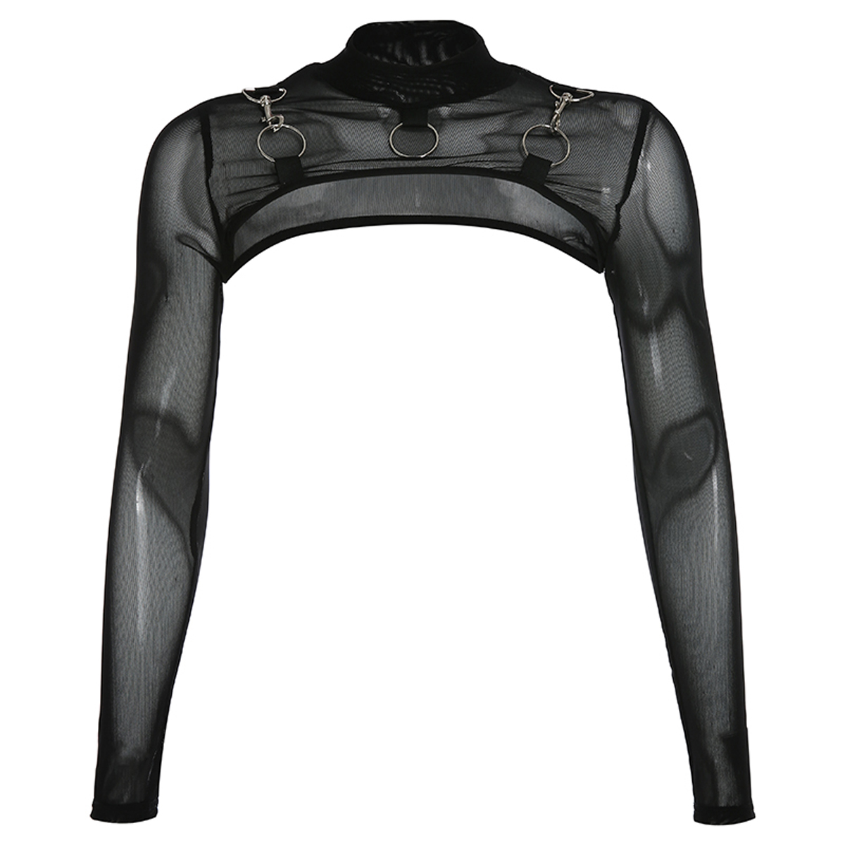 Сексуальный женский короткий топ в стиле хип-хоп, готический, с металлической цепочкой, кружевной прозрачной сеткой, с длинным рукавом, высокая водолазка