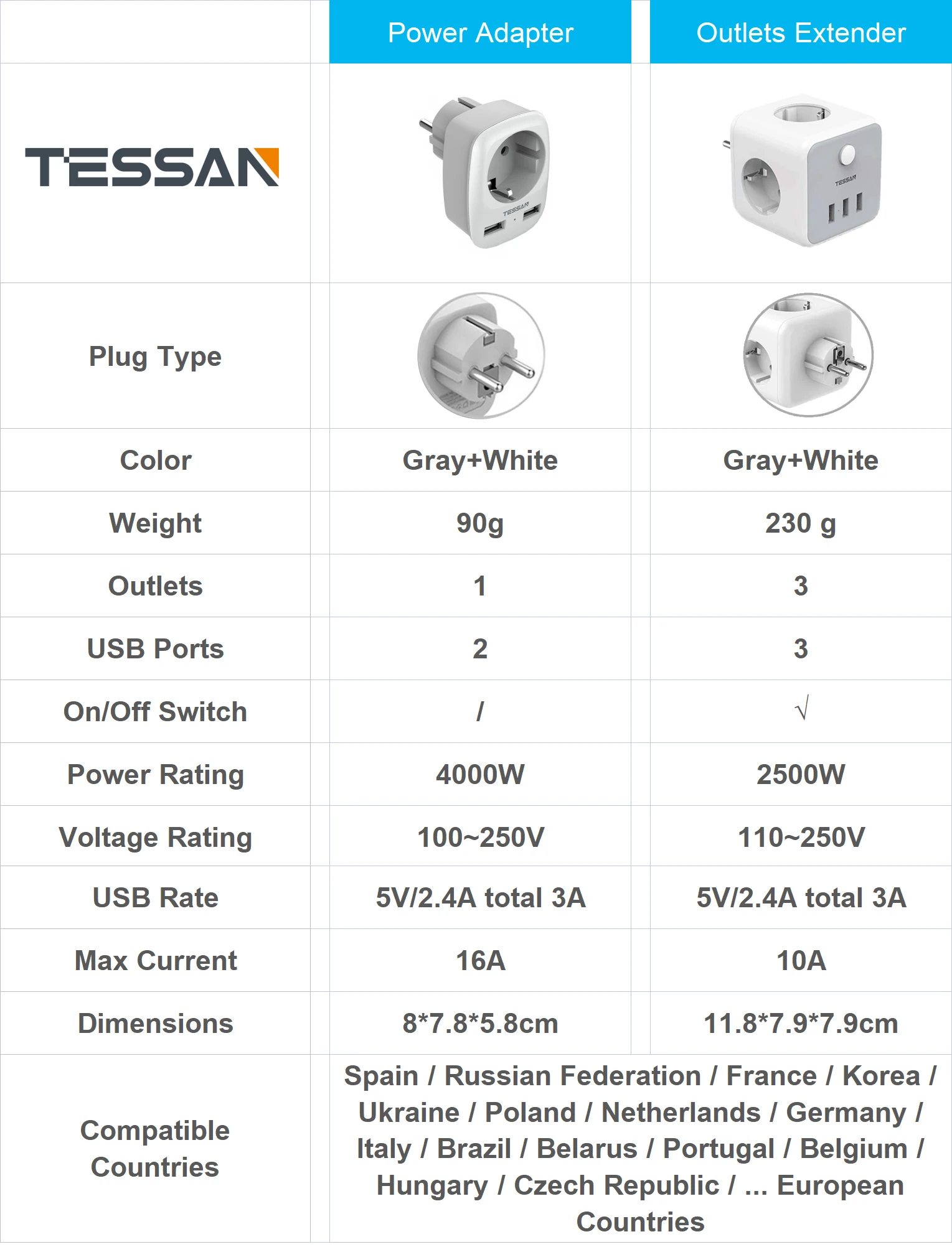 В TESSAN usb-разъем анти вор очень подходит для подключения к обычной Заземленный разъем в Испании (4,8 мм). Просто подключите к любой поверхности розетки в Испании, Расширьте его как 3 розетки вор вилки и тройной USB разъем портов, экономя вам хлопот подключения во многих USB зарядное устройство. Максимальная мощность до 2500 Вт (макс. 250 В, 10 А). С 3 портами (стандарт розетки (3 в общей сложности, 2,4 в каждой максимум).