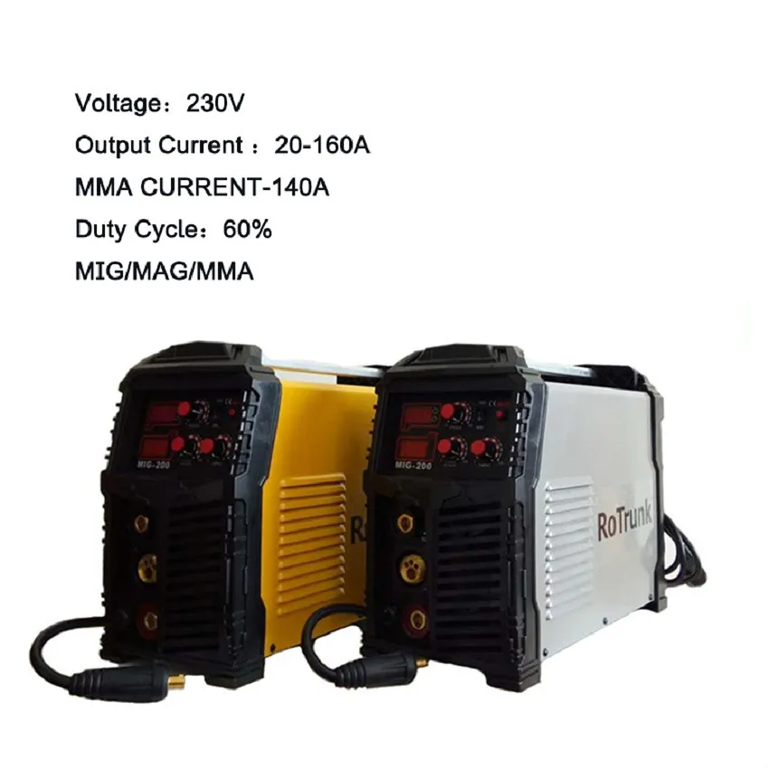 Модель: MIG-200 Вес: 13 кг Размер: 605X305X425 мм Уровень защиты: IP21S Класс изоляции F Номинальное напряжение: 230 В Частота 50/60 Гц Выходной ток 20 ~ 180A Выходной ток 60% Ток ММА 20-140A Особенности: 1.IGBT цифровая система управления 2. Этот сварочный аппарат представляет собой многопроизводственный сварочный аппарат, который используется для (1)MIG (металлическая Сварка инертным газом) Сварка инертным газом, в основном используется для сварки нержавеющей стали, алюминия, меди и других цветных материалов; (2)MAG (металлическая активная газовая сварка) двуокись углерода и другая активная газовая сварка в основном используется в сварочных железных материалах; (3) ручная сварка MMA и другая многоцелевая сварка и т. д. 3. Контроль формы волны, стабильная сварочная дуга; 4. Внутренний Фидер может работать с 5 кг проволочной катушки. Аксессуары: 15AK MIG фонарь с 3 м соединительным кабелем и разъемом Заземляющий зажим с 3 м соединительным кабелем и разъемом Газовая трубка Сварочная щетка Напоминание: Есть два цвета этого сварщика, серый и желтый для выбора, может быть некоторая разница в цвете между реальными продуктами и дисплеем на мониторе из-за разницы в освещении фотографирования светильник. Пожалуйста, обратитесь к товару, который вы получили, для фактического цвета.