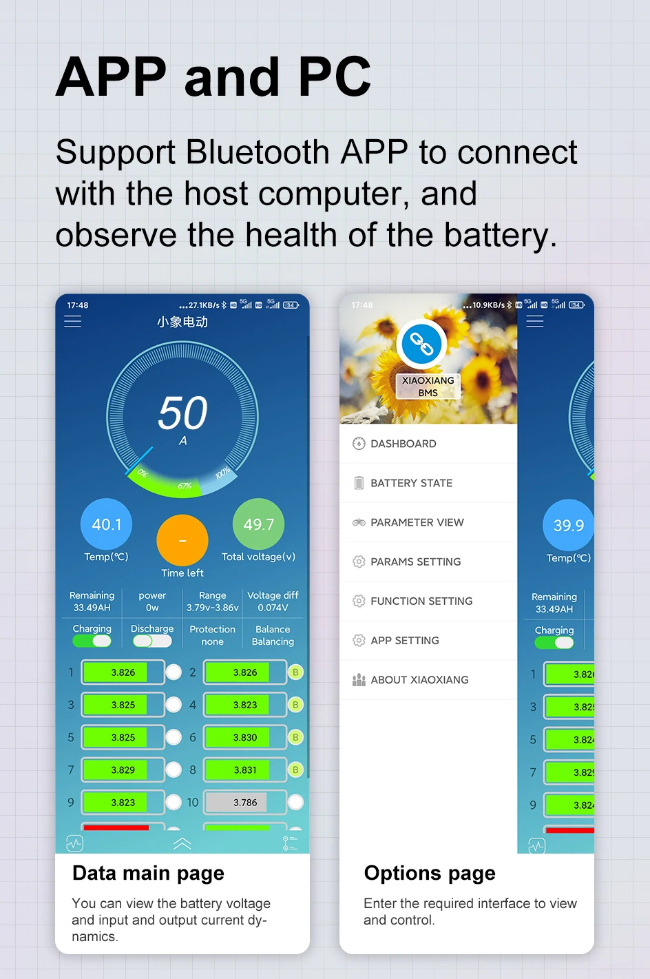1. Приложение для мобильного телефона контролирует состояние зарядки и разрядки аккумулятора. Один аккумулятор перенапряжения и низковольтного напряжения, Аккумуляторный блок перенапряжения и низковольтного напряжения, балансового напряжения, высокой и низкой температуры, и значение релиза можно отрегулировать.