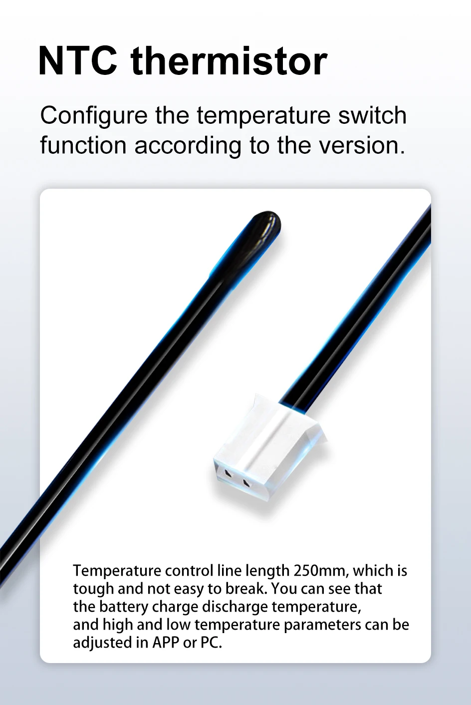 5. Обнаружение контроля температуры: Встроенный сбалансированный контроль температуры BMS для обнаружения. Регулируемая функция защиты от высоких и низких температур, датчик температуры сильный и не легко сломать.