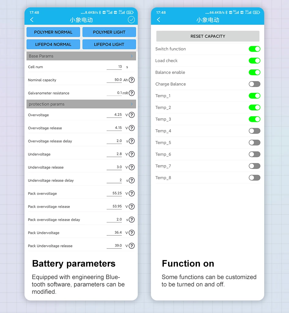 1. Приложение для мобильного телефона контролирует состояние зарядки и разрядки аккумулятора. Один аккумулятор перенапряжения и низковольтного напряжения, Аккумуляторный блок перенапряжения и низковольтного напряжения, балансового напряжения, высокой и низкой температуры, и значение релиза можно отрегулировать.