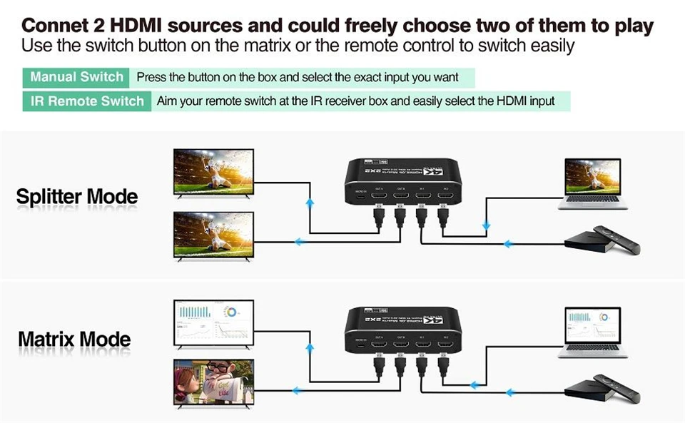 ★[Широкая совместимость]-Эта матрица 2x2 HDMI подходит для различных устройств HDMI, таких как Blu-ray/ DVD/ HD плеер, кабель/спутниковая коробка, Amazon Fire TV, Apple TV, PS3/4, PS5, Xbox, ПК/ноутбук, HD камера, HD DVR и т. д. Он имеет встроенные функции автоматического выравнивания и усиления для обеспечения лучшей передачи без потери качества видео/аудио. Используйте Стандартный HDMI-кабель AWG26 для поддержки максимального входного расстояния 10 метров и максимального выходного расстояния 15 метров.