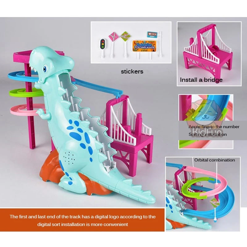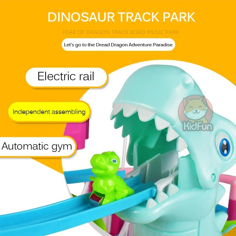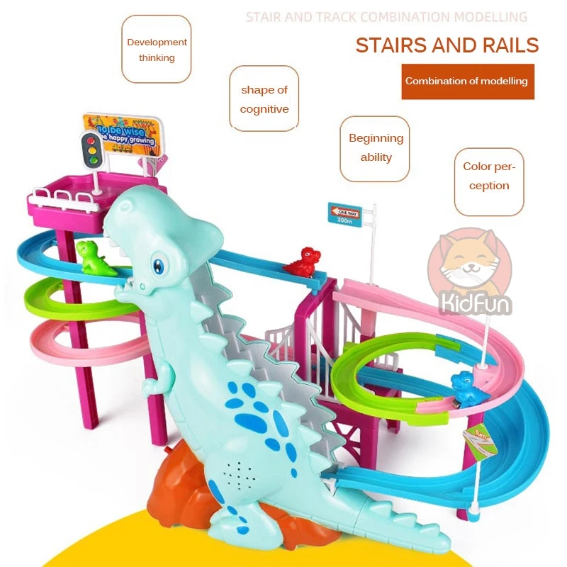 С активацией выключателя маленький динозавр скользит сверху вниз по дорожке, а затем автоматически поднимается к верхней части лестницы. Маленькие динозавры циркулируют и гоняются друг за другом, сопровождаются бликами и динамическими звуковыми эффектами.