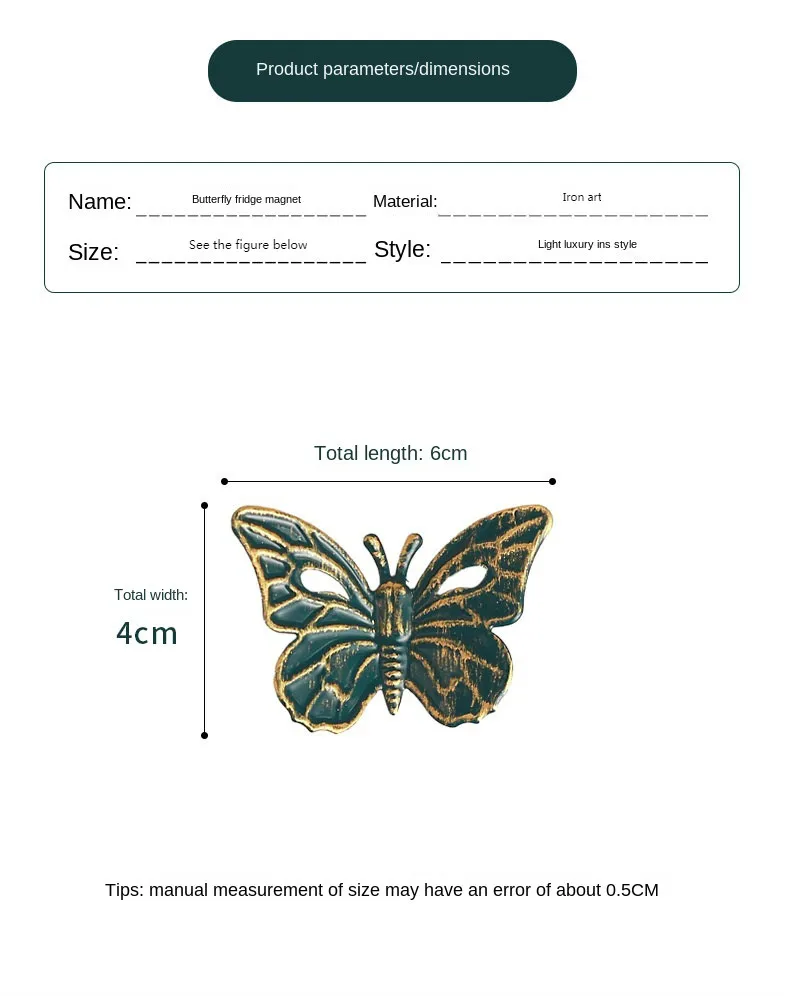 Название продукта: металлическая наклейка бабочки для холодильника Материал: железо Узор: животное/бабочка Стиль: скандинавский стиль Цвет: оранжевый, золотой, синий, зеленый, смешанный цвет Размер: 6*4 см Количество: 4 Преимущества: хороший магнетизм, трехмерный рельеф, процесс позолоты, водонепроницаемость и влагостойкость, устойчивость к ржавчине Место использования: можно адсорбировать на металлический материал в качестве украшения.