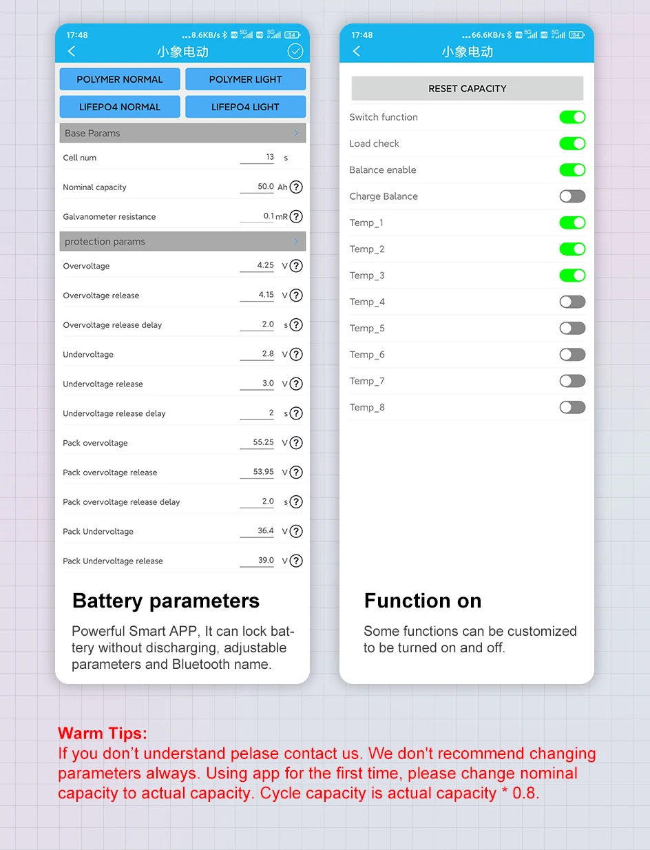 1. Приложение для мобильного телефона контролирует состояние зарядки и разрядки аккумулятора. Один аккумулятор перенапряжения и низковольтного напряжения, Аккумуляторный блок перенапряжения и низковольтного напряжения, балансового напряжения, высокой и низкой температуры, и значение релиза можно отрегулировать.