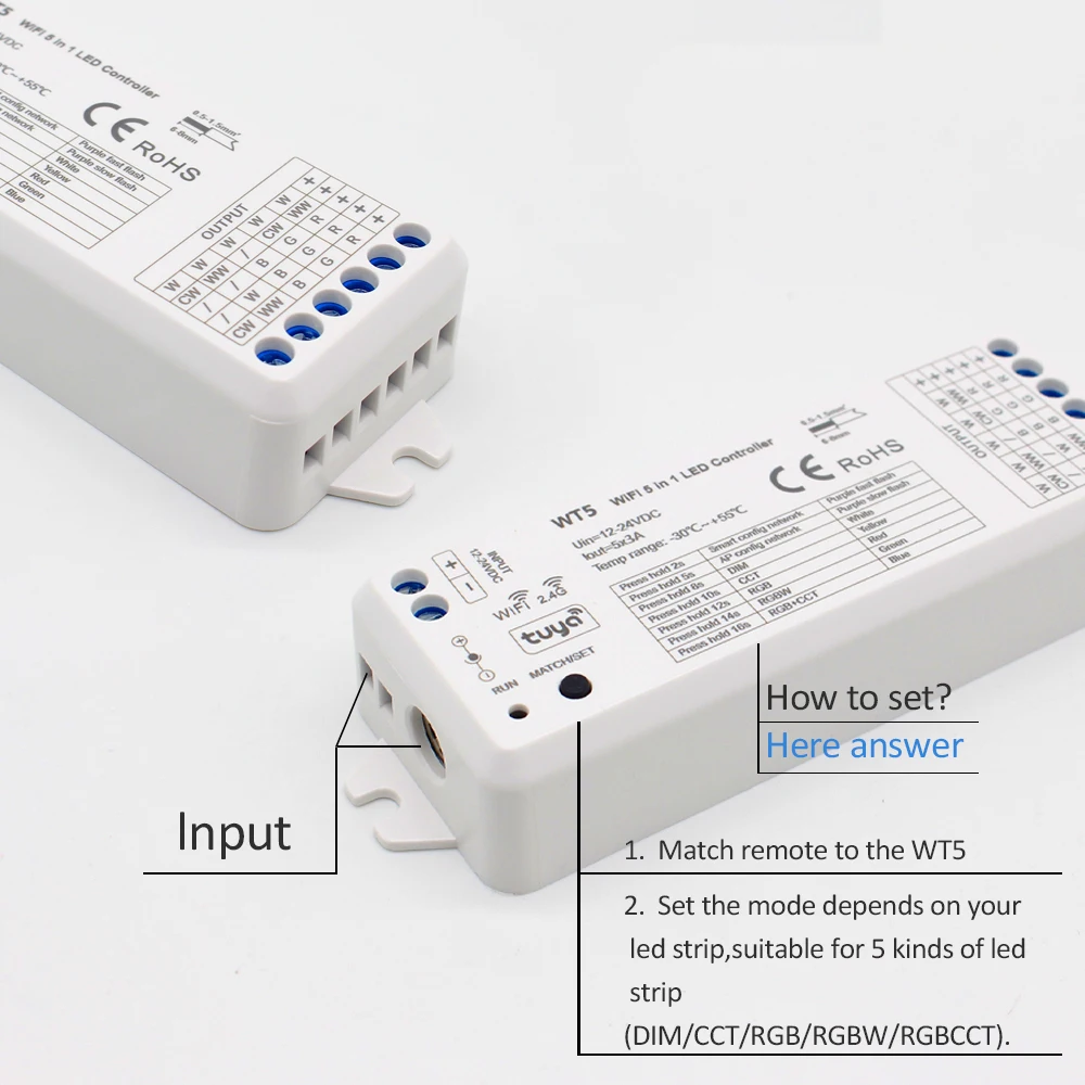 Он используется для 5 видов различных светодиодных лент-светильник,-Одноцветный, CCT, RGB, RGBW, RGBCCT светодиодный ленточный светильник. Перед использованием, пожалуйста, убедитесь в том, что ваш светодиодный светильник соответствует вашей модели. Так что светодиодный индикатор может работать должным образом.
