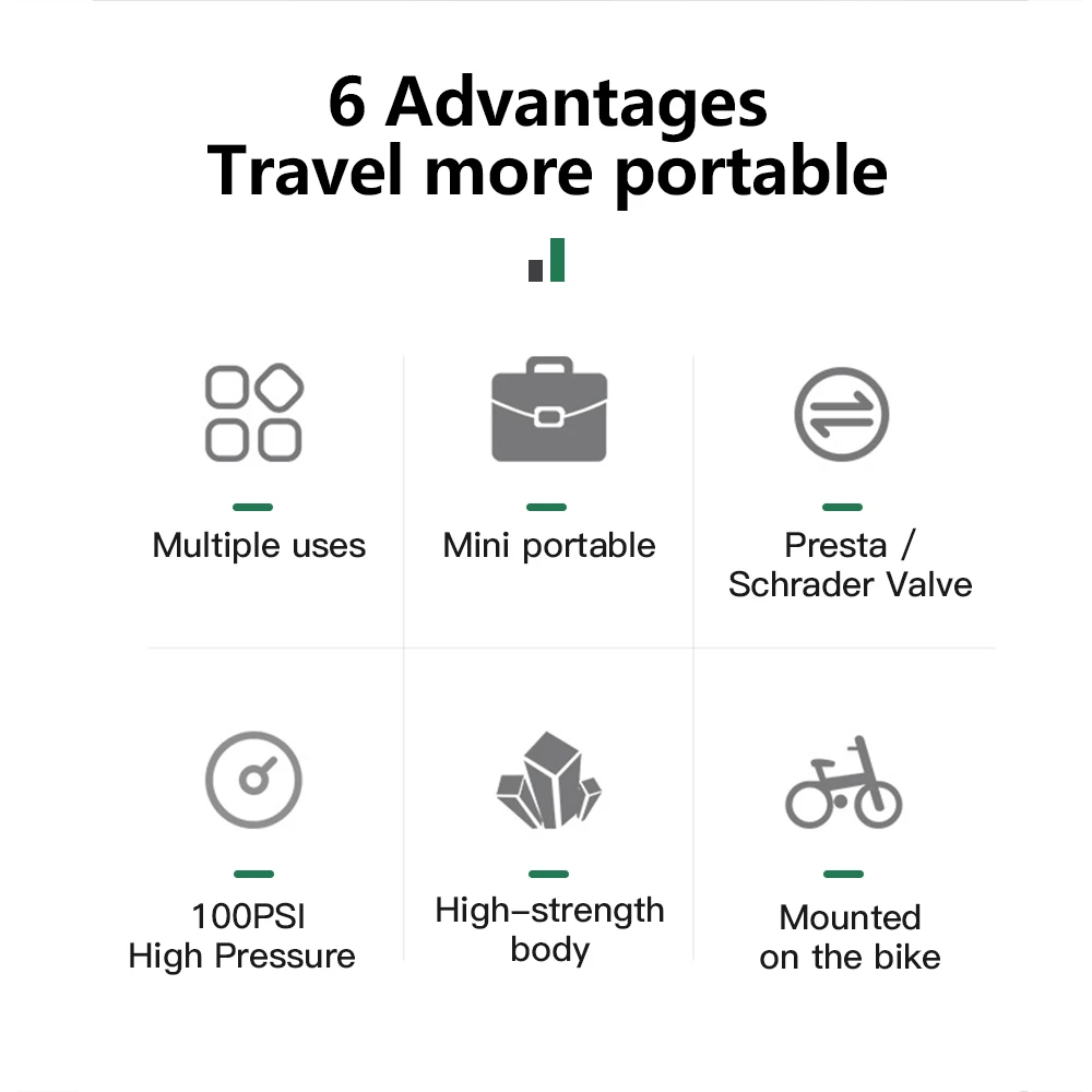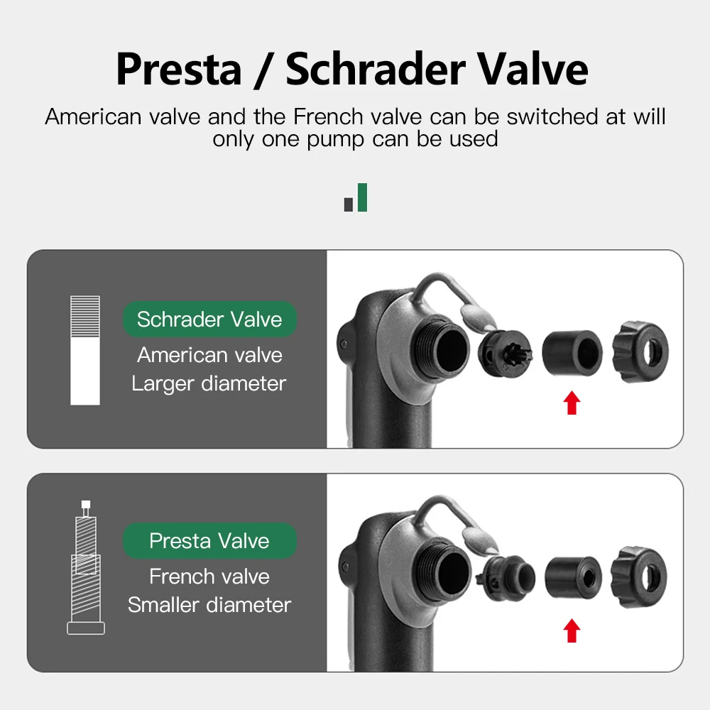 [Система «умный» клапан]:Велосипедный насос handhold сочетается с автоматически совместимым клапаном, подходящим для клапанов Scharder и Presta. Клапаны Сменные не требуются, плотные с клапанами Scharder и Presta без утечки воздуха.