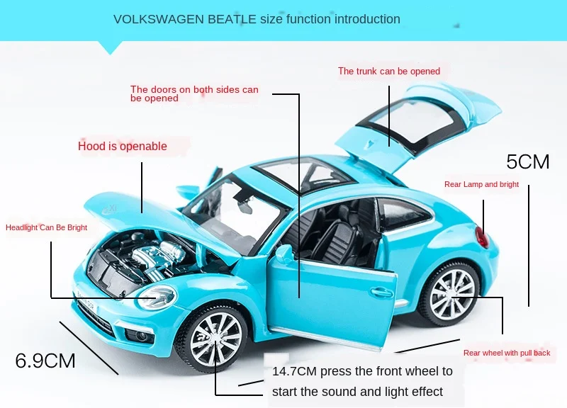 Название модели: Volkswagen Beetle модель автомобиля Пропорции: 1:32 Размер: 15 см * 7 см * 5 см Материалы: сплав Цвет: красный, желтый, розовый, красный Коробка: нет. . Посылка включает в себя: 1 модель автомобиля из сплава (В соответствии с правилами логистики батареи не включены.) Характеристики: открытые двери, светильник, звук. Использование: ремесленные выставки, коллекции, подарки для детей и т. Д.