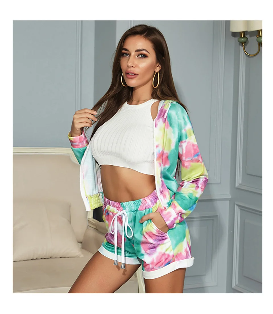 2 шт., новинка, женское цветное пальто с капюшоном и длинным рукавом, топ с высокой талией, шорты на шнуровке, спортивная одежда, набор для бега, фитнеса, спортзала, спортивные костюмы