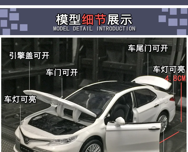 Название модели: автомобиль из сплава имитации Toyota Camry Пропорция: 1:32 Размер: д15 см * ш6 см * h5см Материалы: сплав Цвет: красный, белый, черный, синий Коробка: нет. . Посылка входит: 1 модель автомобиля из сплава (В соответствии с правилами логистики батарейки в комплект не входят.) Особенность: открываются двери, светильник, звук. Использование: крафтовые экспонаты, коллекции, подарки для детей и т. д.