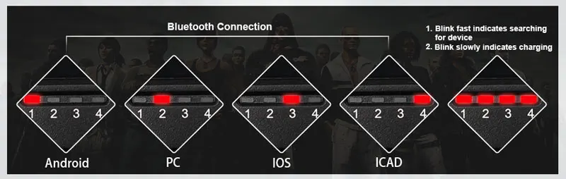 Примечание: Когда геймпад заряжается, на какой платформе находится ваше устройство, на какой платформе светодиодный светильник будет мигать медленно, пока светодиод не будет полностью гореть при полной зарядке. Если батарея низкая, соответствующий светильник платформы также будет мигать, чтобы показать ваше внимание!