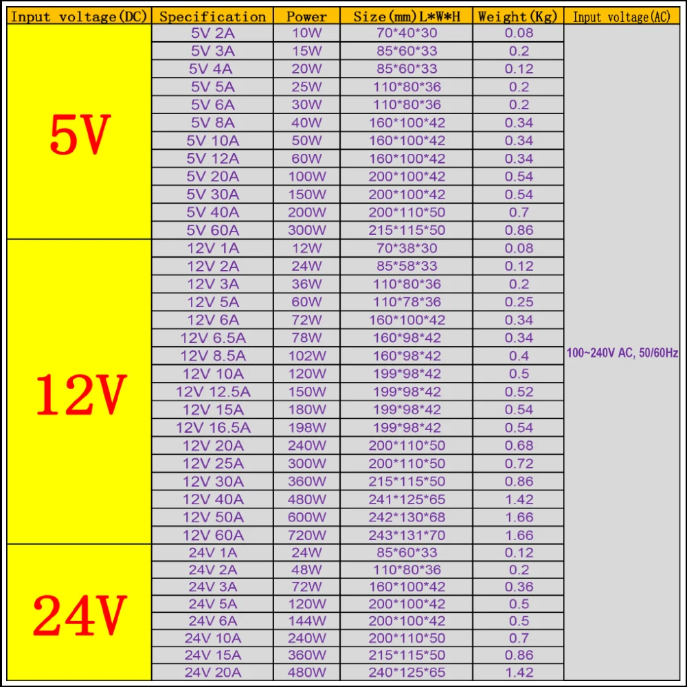Выходной ток: 1A/2A/3A/5A/6A/8.5A/10A/12.5A/16.5A/20A/25A/30A/40A/50A/60A