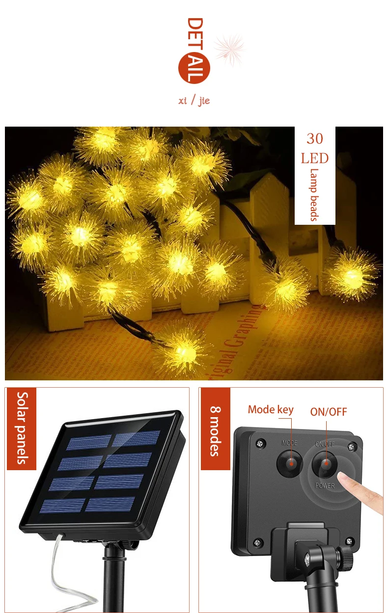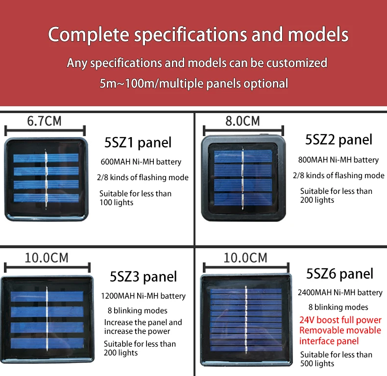 3.12 meters with 100 lights, 22 meters with 200 lights, 32 meters with 300 lights. The solar panel is YK03, the upgraded remote control model, 8 modes.