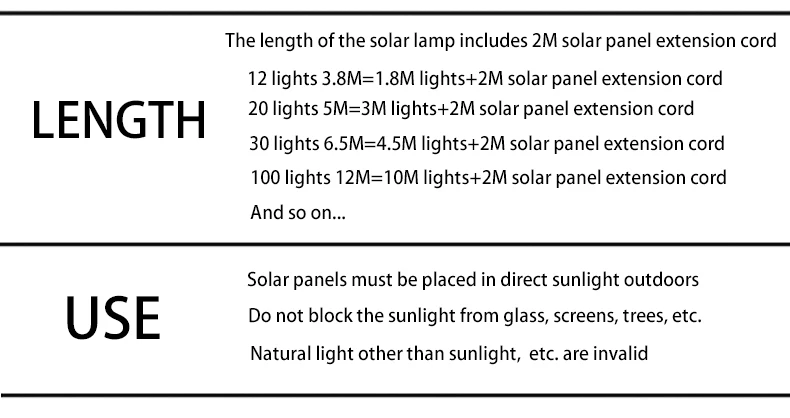 7.【LONG LIFESPAN and LIFETIME WARRANTY】 this solar string light may work for 8-14 hours a time, varied from intensity of sunlight, the volume of solar energy stored everyday and the mode selected; with waterproof design, this solar string light may be used for at least 30,000 hours.