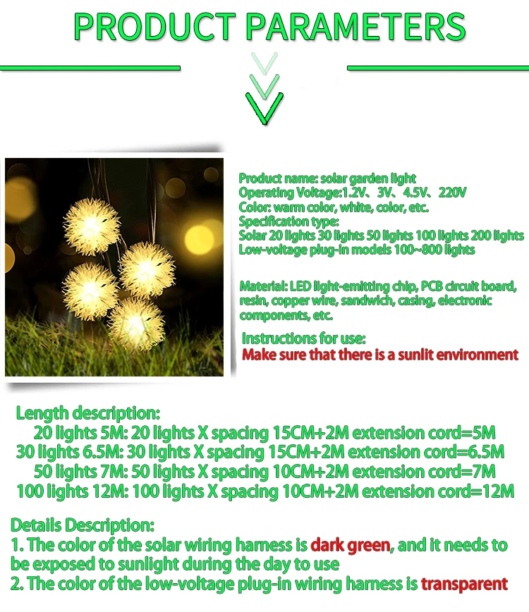 1.5 meters with 20 lights, 6.5 meters with 30 lights, 7 meters with 50 lights. The solar panel is Z1 panel, with 2 modes of beating.