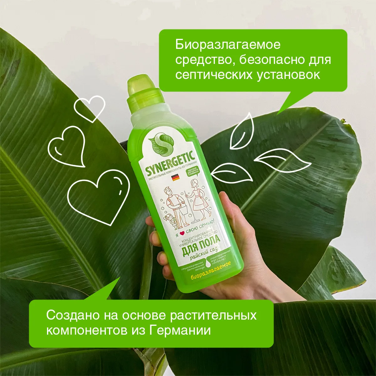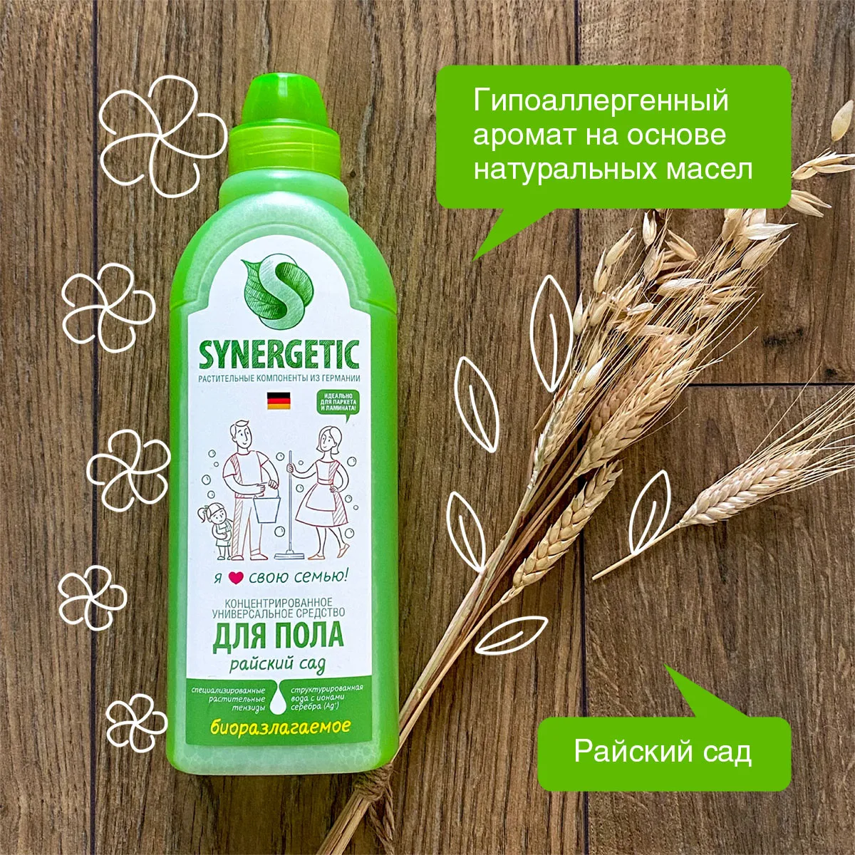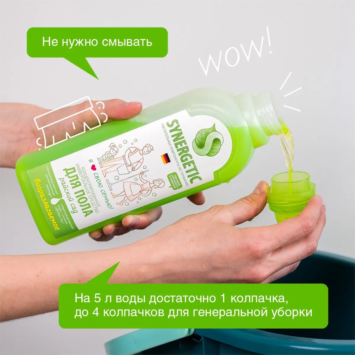 Биоразлагаемое средство для мытья поверхностей SYNERGETIC «Райский сад» – универсальное средство для ежедневной и генеральной уборки пола и других поверхностей: столов, стен, потолка. Не требует смывания, идеально подходит для паркета ламината, плитки, линолеума, камня, металла, стекла, пластика, дерева, обоев. Средство подходит для ручной уборки и чистки моющим пылесосом, а также для уборки в детских помещениях. Комплекс мягких биоразлагаемых тензидов, полученных из растительных масел, и зеленых хелатов обеспечивает высокое качество уборки поверхностей даже при использовании холодной и жесткой воды, эффективно удаляет загрязнения и неприятные запахи. Средство обладает антибактериальным действием за счет синергетической комбинации мягких растительных К-тензидов и натуральных эфирных масел. Гипоаллергенная отдушка на основе эфирных масел жасмина, пачули, розы, нероли и ветивера придает средству приятный цветочный аромат, который подходит для людей с чувствительной кожй. Состав: Подготовленная вода ˃ 30%, цитрат натрия 5-15% , комплекс растительных Н-тензидов ˂ 5% , комплекс растительных К-тензидов ˂ 5% , комплекс растительных Н-тензидов (на основе глюкозы) ˂ 5% , зеленый хелат GLDA ˂ 5% , парфюмерная композиция «Эдем» (масла жасмина, пачули, нероли, розы, ветивера), пищевой краситель (зелёное яблоко R100). Состав: Подготовленная вода ˃ 30%, цитрат натрия 5-15% , комплекс растительных Н-тензидов ˂ 5% , комплекс растительных К-тензидов ˂ 5% , комплекс растительных Н-тензидов (на основе глюкозы) ˂ 5% , зеленый хелат GLDA ˂ 5% , парфюмерная композиция «Эдем» (масла жасмина, пачули, нероли, розы, ветивера), пищевой краситель (зелёное яблоко R100).