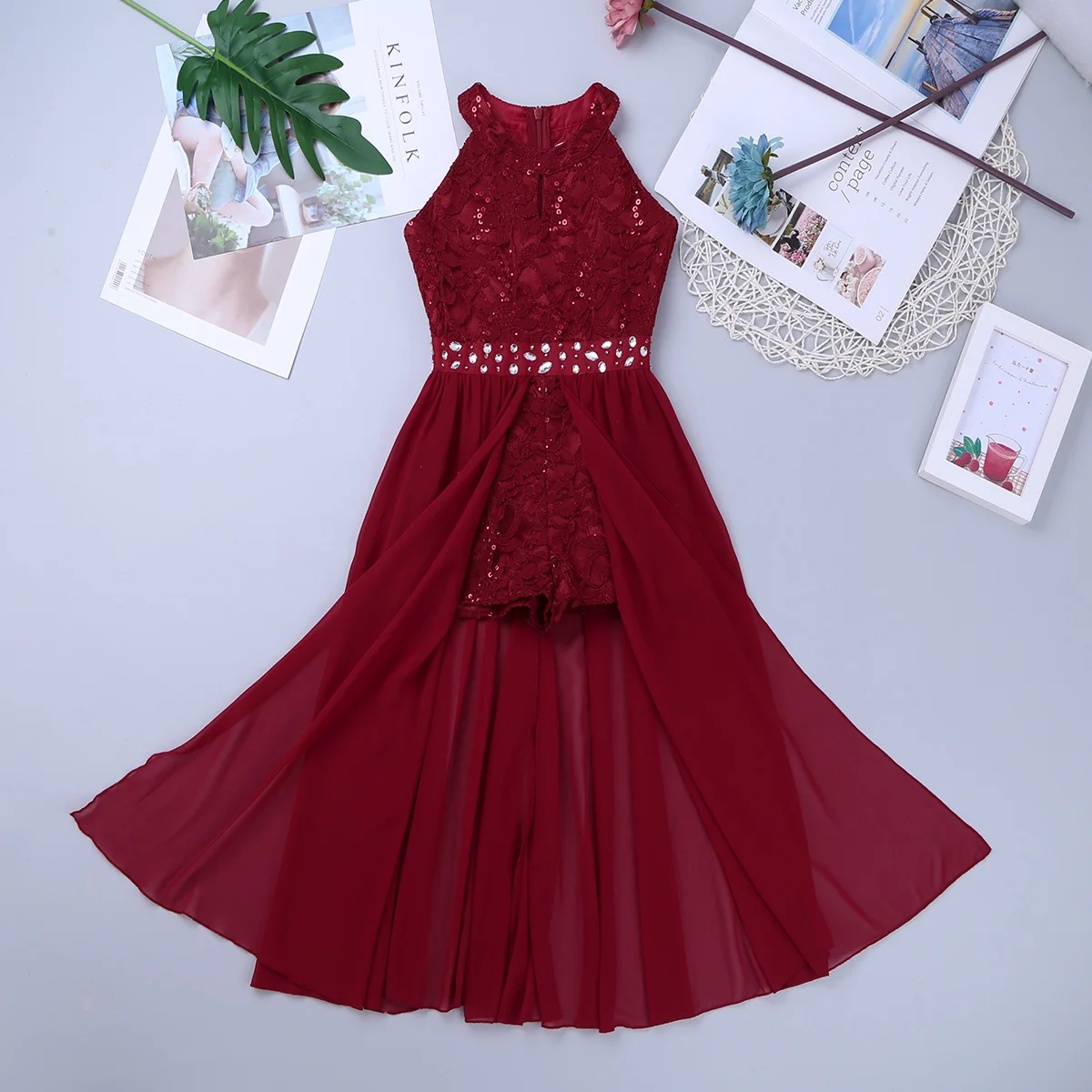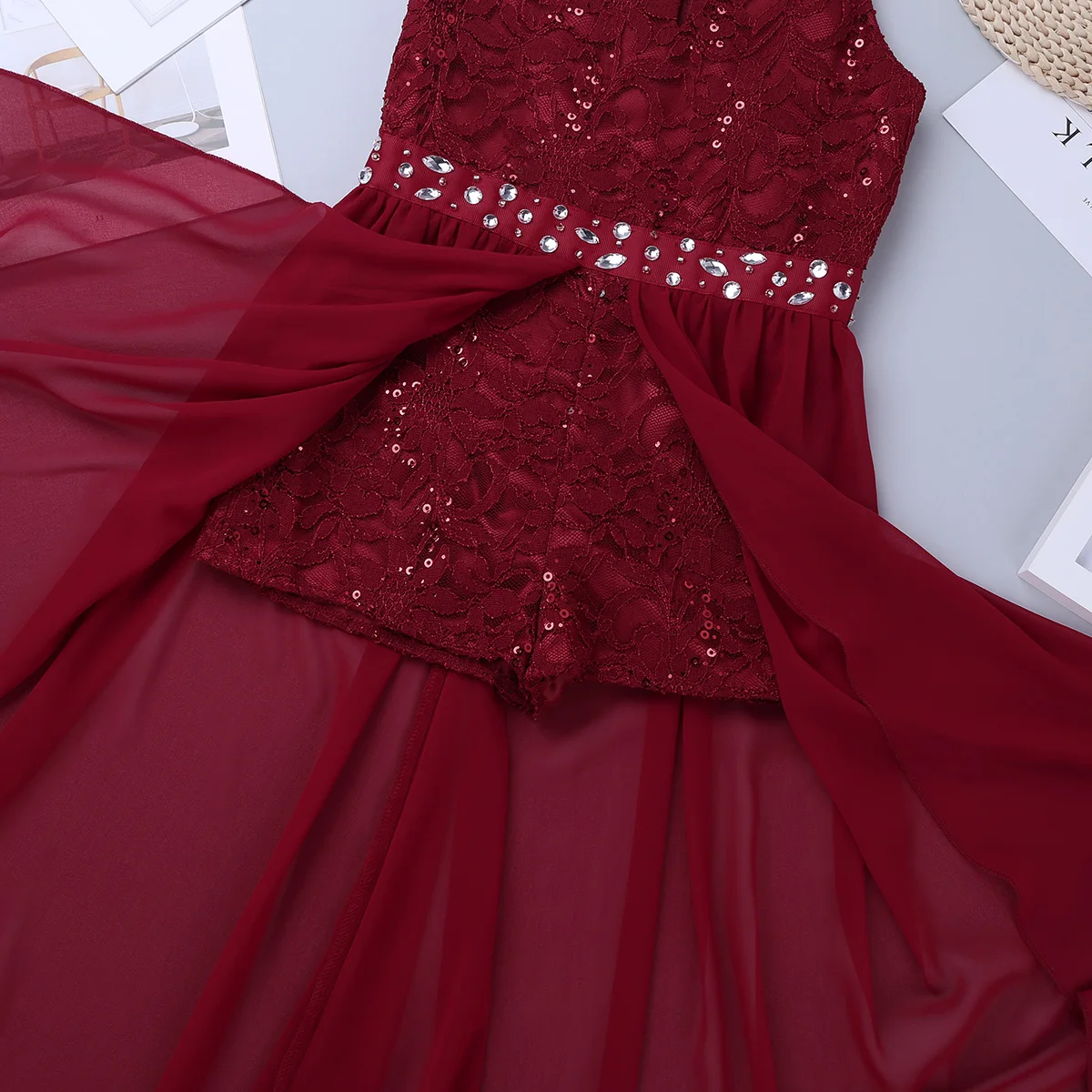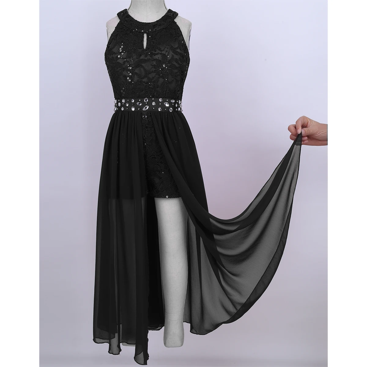 Платье-комбинезон изготовлено из полиэстера и шифона, ручная стирка.