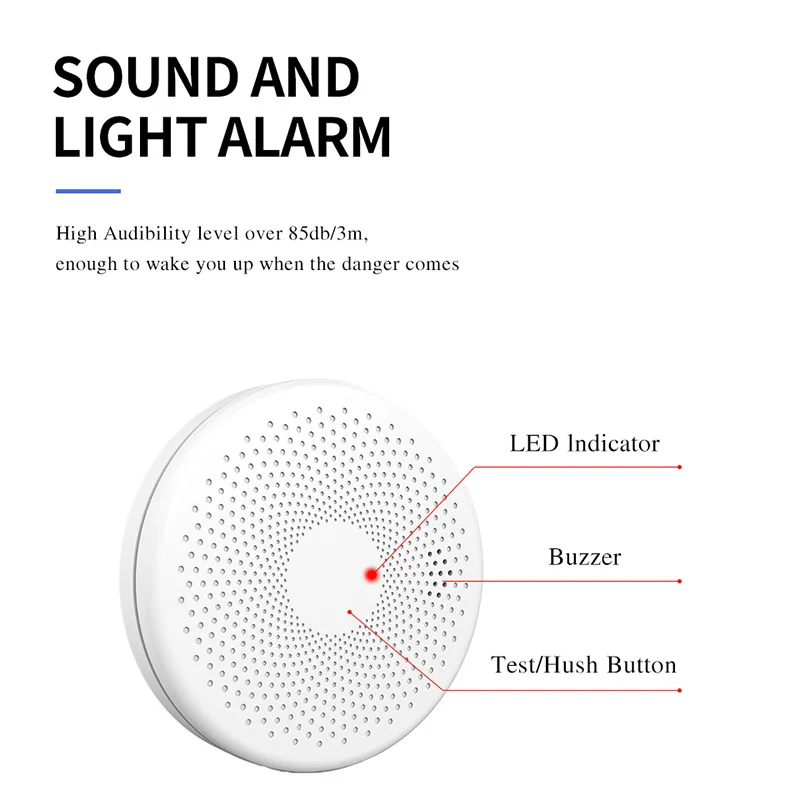 Этот продукт использует маломощный модуль Tuya Smart со встроенным решением Wi-Fi для подключения продукта к облачной платформе Tuya. Когда продукт обнаруживает пожар, он автоматически подтолкнет информацию о пожарной сигнализации к «умному приложению Tuya», чтобы напомнить пользователям о необходимости защиты вашей жизни и собственности.