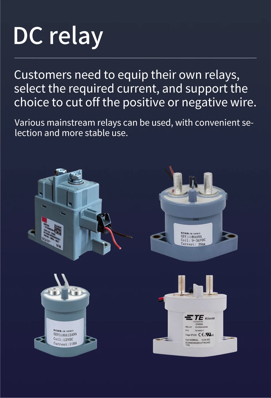 * Реле является основным переключателем цепи. Вы можете выбрать различные токи, но максимальный ток не превышает 500А. Рекомендуется, чтобы Рабочая Потребляемая мощность была менее 500мА. BMS обеспечивает только Регулируемое напряжение 12 В для контроля введения реле.