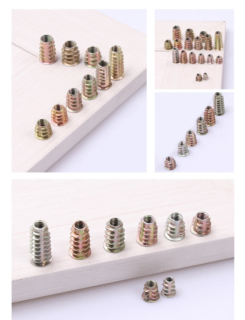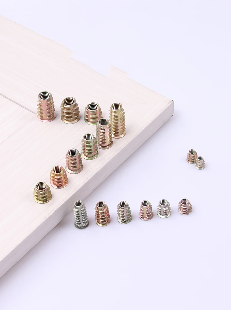 Особенности вставной гайки: Эти резьбовые вставки вставляются в предварительно просверленное отверстие путем вкручивания, в этом случае внешние Выступающие впиваются в древесину, предотвращая поворот или вытаскивание гайки.