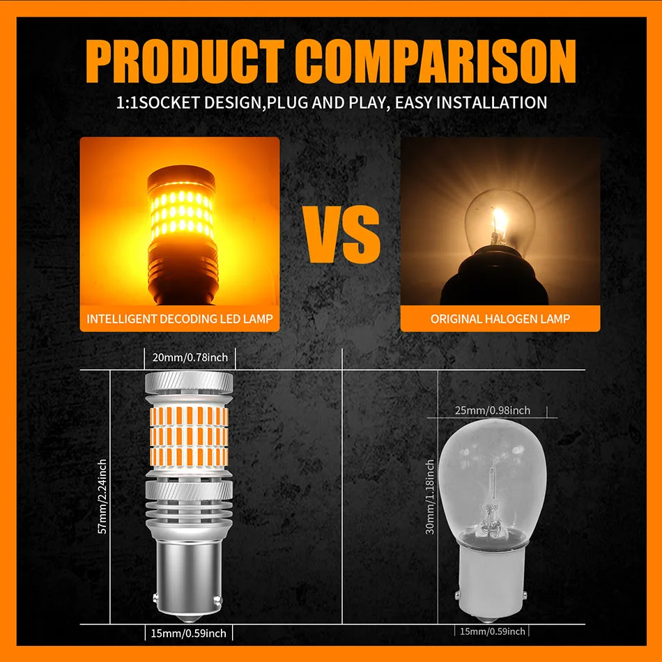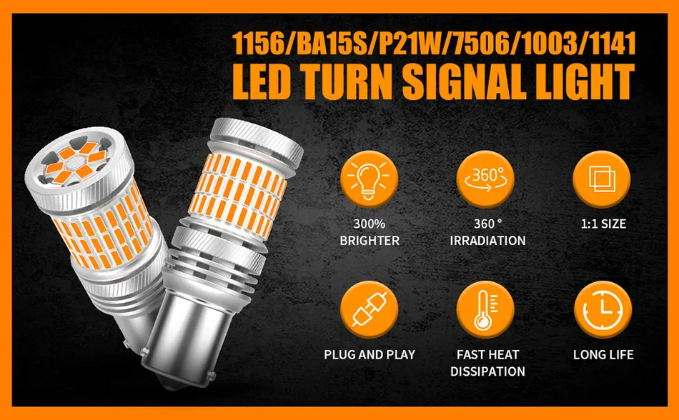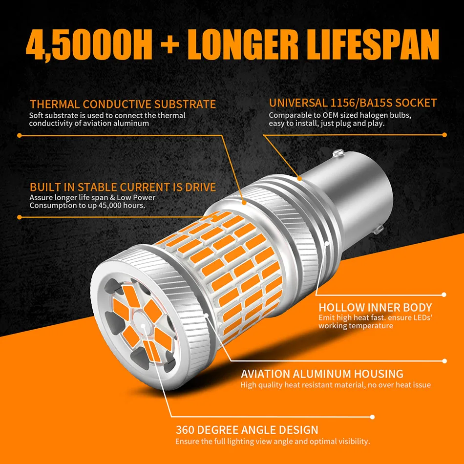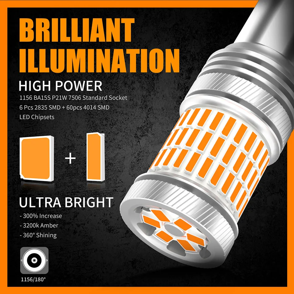 Каждый светодиодный светильник с поворотным сигналом имеет 6 чипов 2835 SMD сверху, что значительно делает светильник более сфокусированным и мощным, когда светильник отражается от поворота сигнальный светильник в сборе на земле. 6 шт. 2835 SMD чипы плюс 60 шт. 4014 SMD чипы, угол освещения 360 °, примерно на 300% ярче, чем галогенная лампа.