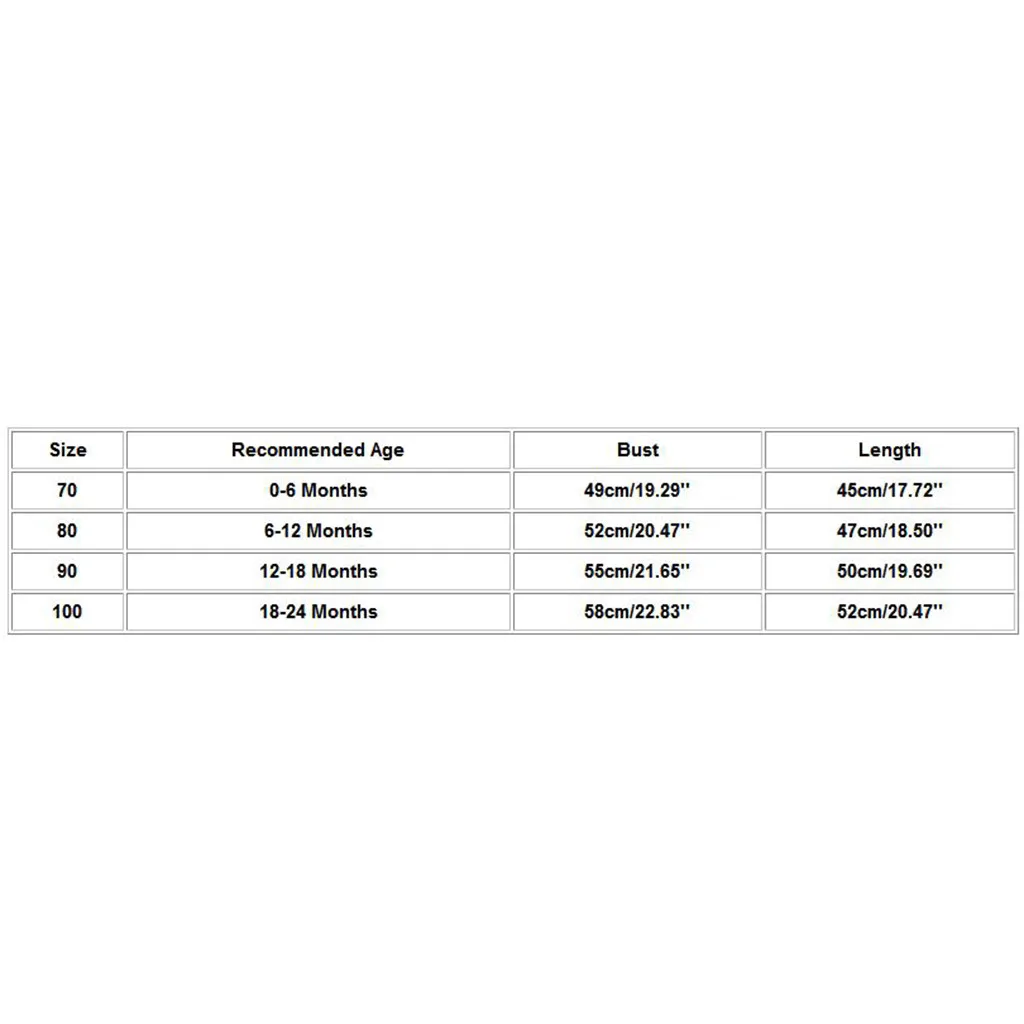 Размеры Рекомендуемый возраст Бюст Длина 70 0-6 месяцев 49 см/19,29'' 45 см/17,72'' 80 6-12 месяцев 52 см/20,47'' 47 см/18,50'' 90 12-18 месяцев 55 см/21,65'' 50 см/19,69'' 100 18-24 месяцев 58 см/22,83'' 52 см/20,47''