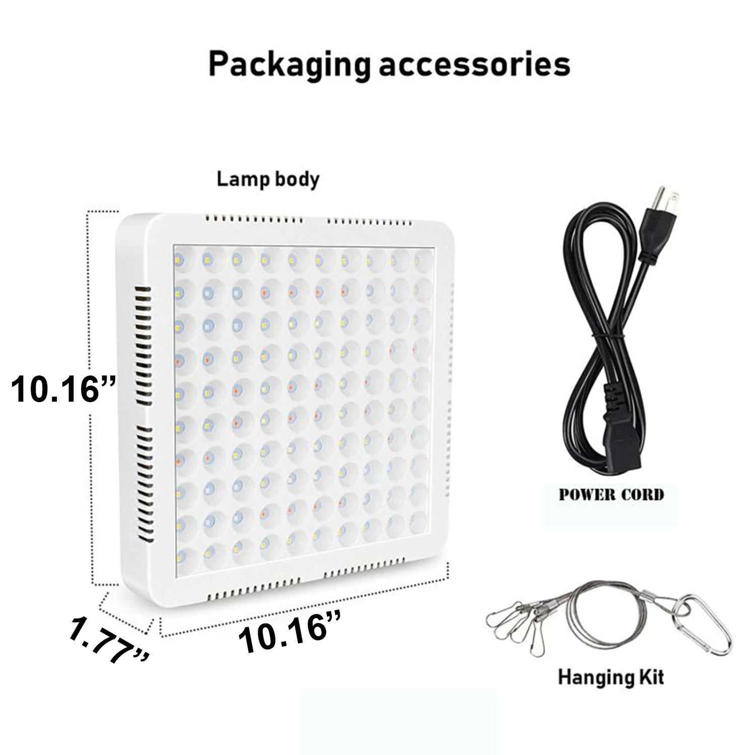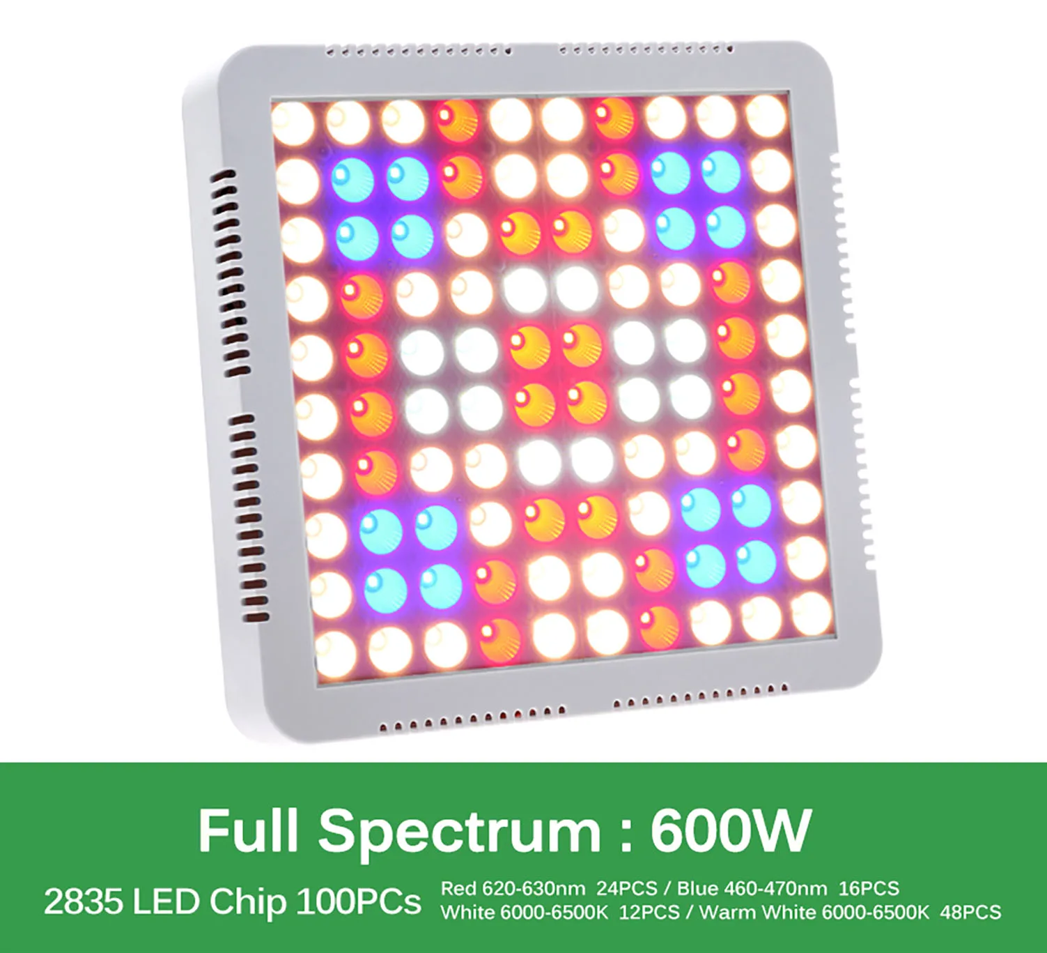 1. Номинальная мощность: 600 Вт 2. Фактическая мощность: 80 Вт 3. Входное напряжение: AC85-265V 4. Светодиод: Epi 2835 Светодиодный s 5. Длина волны лампы: Красный 3000-6000 нм, синий нм, теплый белый K, чистый белый K, УФ нм, ИК нм 6.IP42 водонепроницаемый 7. Рабочая температура: -20 ℃-40 ℃ 8. Люмен: лм 9. Срок службы> 50000 ч 10. Размер: 258*258*45 мм 11. Количество светодиодов: 100 шт.