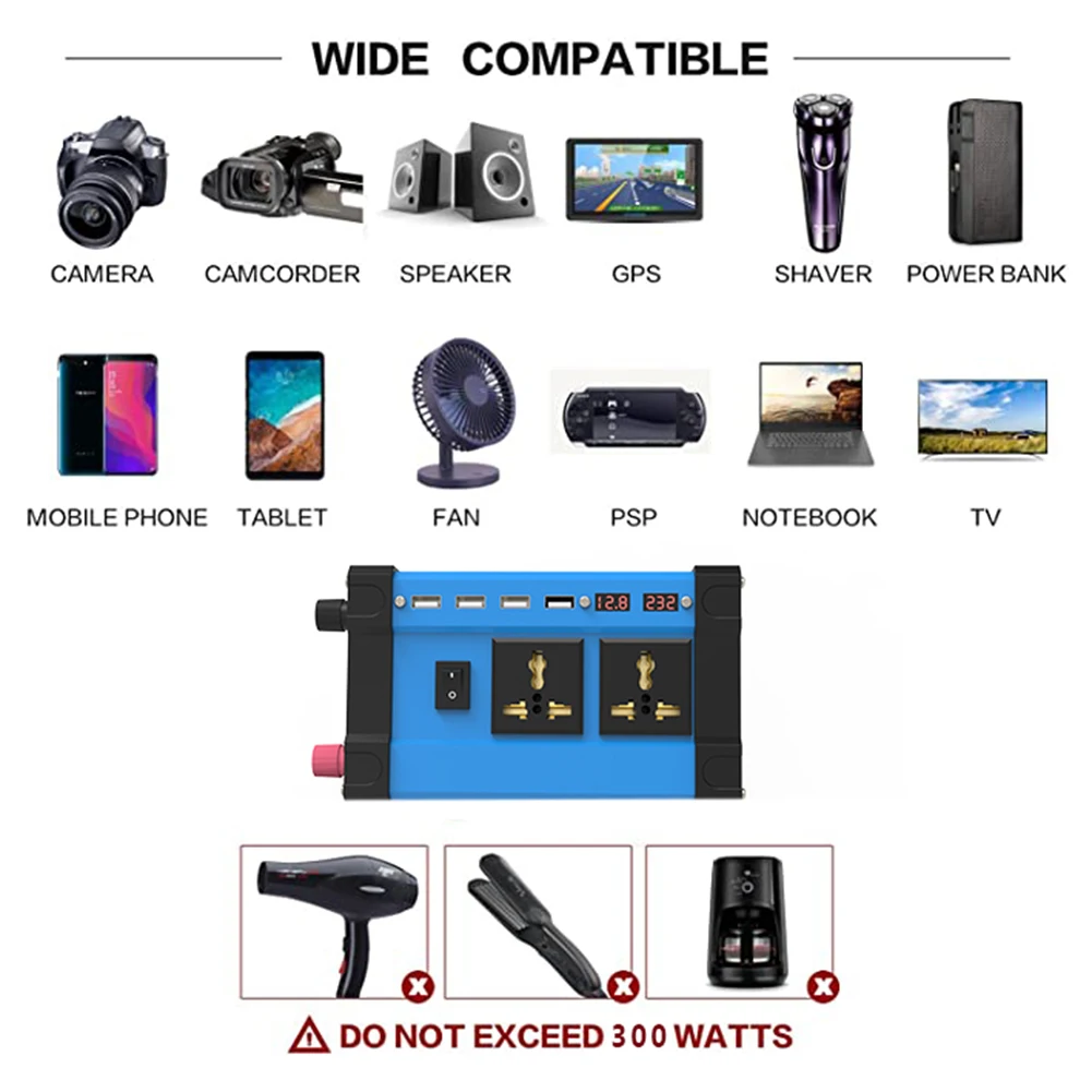 * 1. Это модифицированный синусоидальный инвертор, не подходит для устройств, которые работают со встроенным мотором, фены, кондиционеры, кофемашина, водяной насос, индукционная плита, холодильники и микроволновые печи и т. д. Убедитесь, что общая номинальная мощность подключенных устройств ≤ 300 Вт