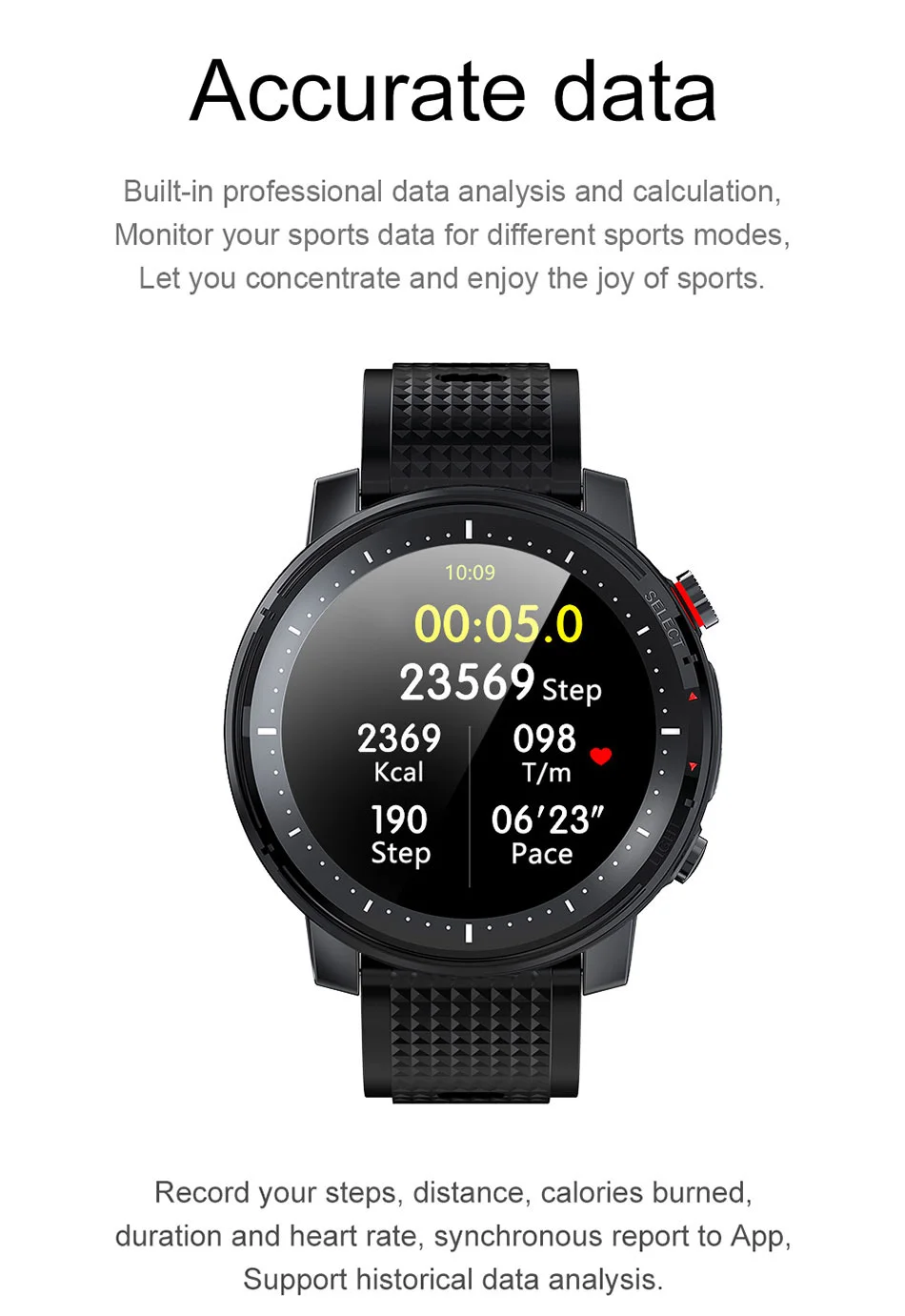 IP68 водонепроницаемый,1,3 дюймов IPS 360*360 пикселей с полным круглым дисплеем, 370 мА/ч, батарея, 7 дней Время работы от аккумулятора частота сердечных сокращений, ЭКГ, измерять кровяное давление/кислорода в крови, шагомер, секундомер, управление музыкой, скалолазание, камера, фонарик.