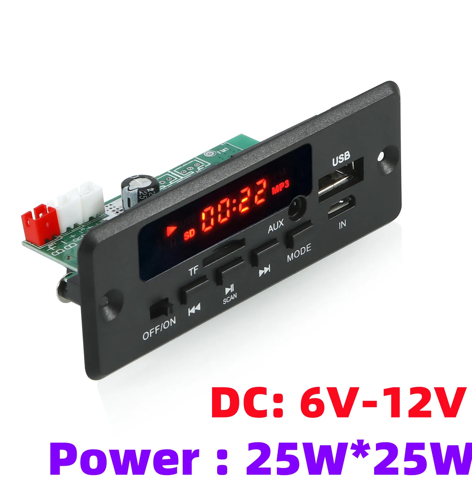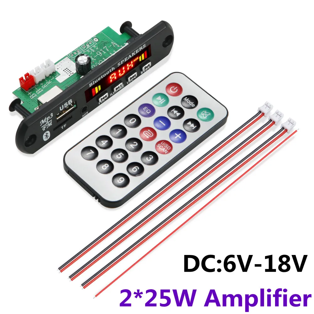 Версия Bluetooth-Версия 5,0MP3 / wma музыкальный форматМощность: 2 * (25) Вт, можно подключить к двум динамикам 4 Ом или 8 Ом 25 ВтЧастота FM: 87,5-107,5 МГцПоддержка функции введения: поддержка mp3 / USB / TF / Aux / FM / Bluetooth/пульта дистанционного управления/DC: 6в-18вОсобенности:1. Поддержка переключателей USB / TF / Bluetooth / FM / aux.2. Поддержка музыки в формате mp3 / wma / WAV.3. Поддержка переключателя USB/карты, музыки, следующей песни, регулятора громкости, эквалайзера, воспроизведения/паузы, остановки, отключения звука, выключения питания, прямого выбора песен.4. Поддержка предыдущей песни Bluetooth, следующей песни, регулировки громкости, воспроизведения/паузы, отключения звука.5. Поддержка памяти при отключении питания6. Поддержка записи. Запись поддерживает только режим TF или USB.(Нажмите и удерживайте кнопку mode, чтобы начать запись, нажмите и удерживайте кнопку mode еще раз, чтобы отменить запись и воспроизвести файл записи; Чтобы выйти из режима записи, нажмите и удерживайте кнопку паузы для выхода. При записи необходимо подключить запоминающее устройство, например U-диск или TF-карту7. Напряжение источника питания поддерживает 6-12 В постоянного тока, а ток составляет от 1 до 3 А.Комплектация:1 декодер1 пульт дистанционного управления (без батареи)