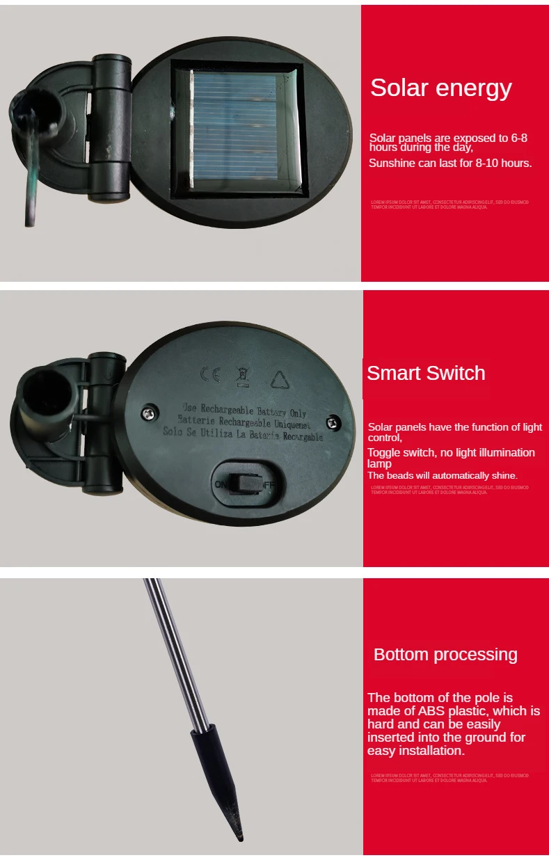 2. 【Длительное время работы 】 благодаря встроенной перезаряжаемой батарее емкостью 600 мА · ч. Этот солнечный светильник s напольный будет светильник до 10 часов после полной зарядки. Время зарядки: 4-6 часов. Никаких проводов и внешнего электричества не требуется. Легко устанавливается.