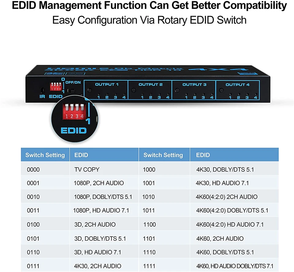 EDID управление: Этот 4x4 HDMI матричный сплиттер поддерживает возможности обработки EDID, и имеет 16 EDID режимов, которые могут распознать параметры устройства дисплея и сделать его подходящим к оборудованию, В результате улучшенное качество изображения. Этот матричный коммутатор 4x4 HDMI также может управлять ИК-пультом дистанционного управления. После установки EDID перезагрузите Матричный Коммутатор HDMI.