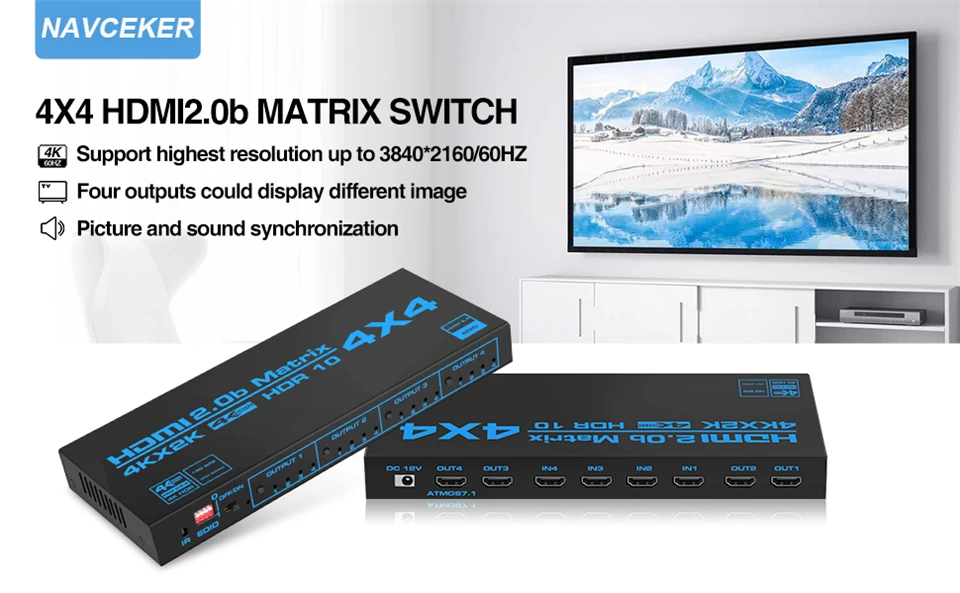 HDMI MATRIX 4x4 - Navceker HDMI matrix 4 входа и 4 выхода с ИК-пультом дистанционного управления можно подключить 4 HD источника сигнала к 4 HD дисплеям. Каждый выход HDMI может поделиться тем же или другой картинкой, и позволяет легко переключаться или разделяться на 4 HDMI совместимых мониторов или проекторов.