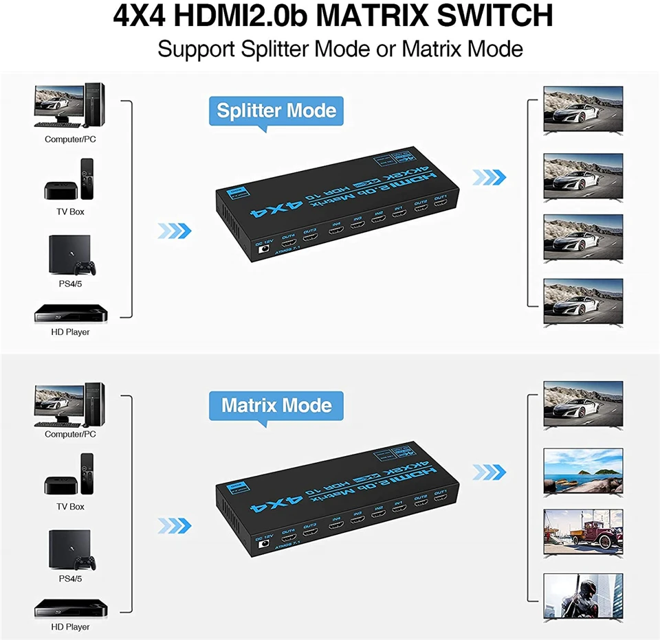 Матричный коммутатор HDMI2.0b ULTRA HDMI-поддерживает 4K @ 60 Гц, HDCP 2,2, RGB 8:8:8, YUV 4:4:4, 4K HDR. Поддержка скорости передачи данных 18 Гбит/с и максимальной пропускной способности до 600 МГц. Поддержка глубокого цвета 8/10/12 бит. Поддержка DTS-HD, Dobly-True HD, LPCM7.1, Dobly-AC3, DSD и т. д. по основном Поддерживаются все доступные аудио-опции. Примечание: Эта Матрица HDMI будет отображать меньшее разрешение 4 устройств, а разрешение 4 выходных экранов будет таким же.