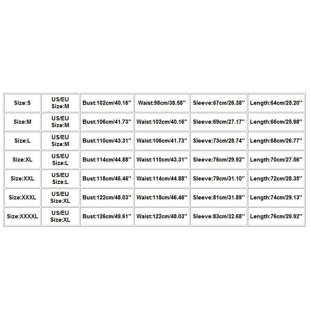 Size US/EU Size Bust Waist Sleeve Length S M 102cm/40.16'' 98cm/38.58'' 67cm/26.38'' 64cm/25.20'' M M 106cm/41.73'' 102cm/40.16'' 69cm/27.17'' 66cm/25.98'' L M 110cm/43.31'' 106cm/41.73'' 73cm/28.74'' 68cm/26.77'' XL L 114cm/44.88'' 110cm/43.31'' 76cm/29.92'' 70cm/27.56'' XXL L 118cm/46.46'' 114cm/44.88'' 79cm/31.10'' 72cm/28.35'' XXXL XL 122cm/48.03'' 118cm/46.46'' 81cm/31.89'' 74cm/29.13'' XXXXL XL 126cm/49.61'' 122cm/48.03'' 83cm/32.68'' 76cm/29.92''