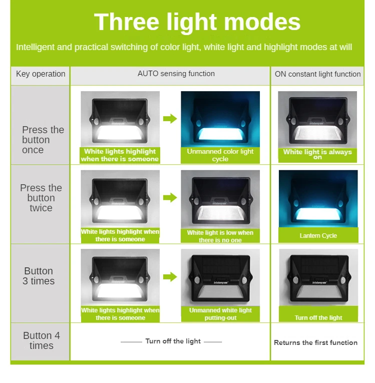[Спортивная светильник и 3 светильник режимов]-это Солнечный настенный светильник продукт имеет 3 затемнения режимы: цвет светильник, белый светильник, и регулировка яркости по своему желанию. Наш светильник датчика движения является новым обновлением по сравнению с датчиком светильник s на рынке. Он имеет двойной датчик 180 градусов, который имеет более широкий диапазон чувствительности и более чувствительный.