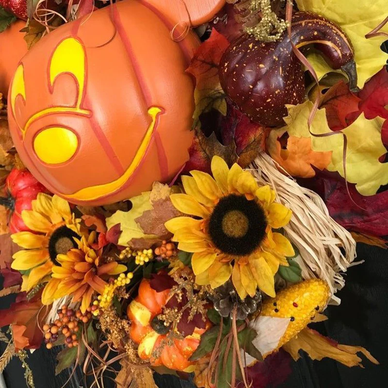 2. В центре находится Культовая тыква, окруженная красивой осенней листвой и небольшими тыквами.