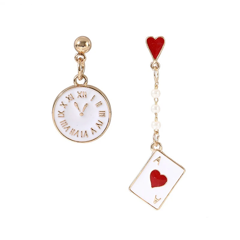 Золотые, красные, персиковые часы Алисы, часы, висячие серьги с карточкой для покера, асимметричная серьга, модные ювелирные изделия, длинные серьги с жемчугом для женщин