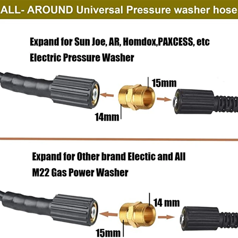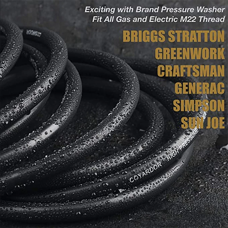 Практическая функция: шланг для мойки высокого давления с внутренней резьбой M22, совместим с фитингами M22 14 мм и M22 15 мм, максимальная рабочая температура до 14 градусов по Фаренгейту/60 градусов Цельсия; Могут быть установлены силовые шайбы до 2800 фунтов на квадратный дюйм; Обратите внимание, что это мойка высокого давления, а не садовый шланг, и применяется только к пистолетам для мойки давления