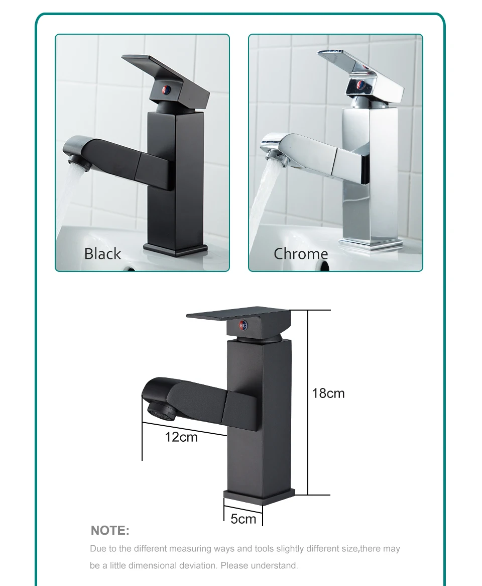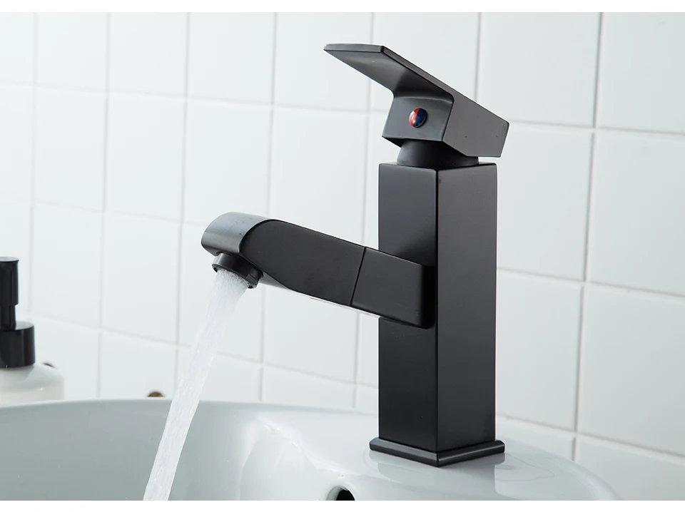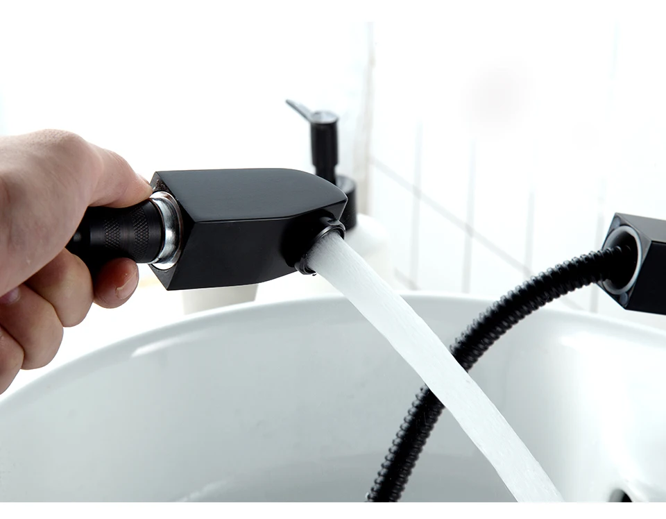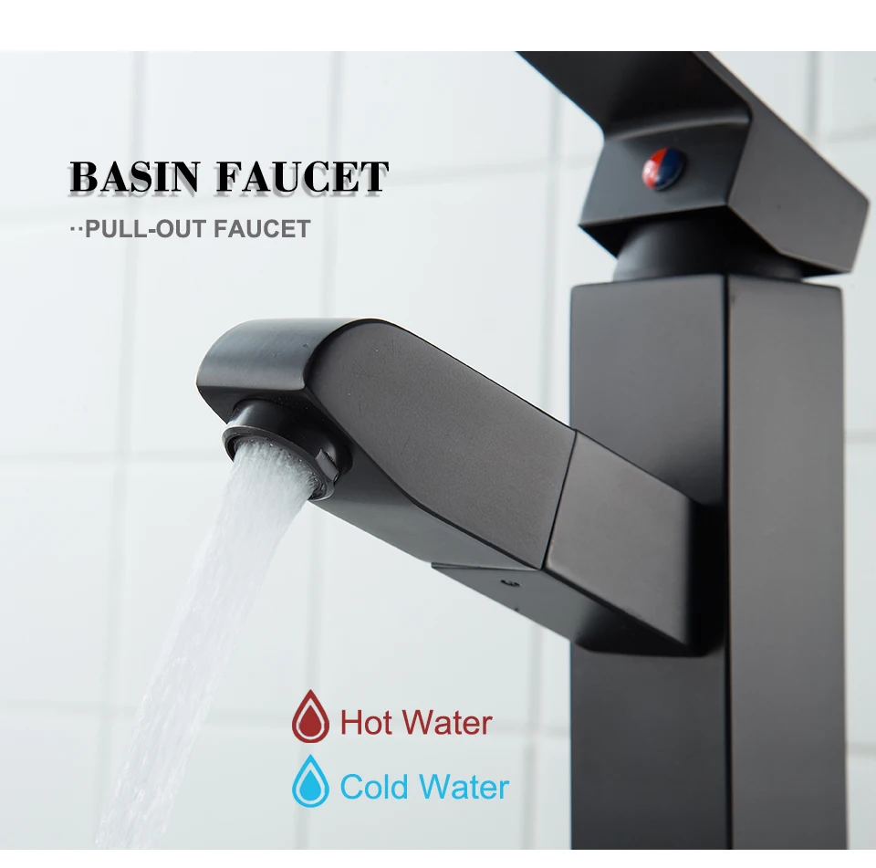 Выдвижной матовый черный смеситель для раковины, латунь для ванной комнаты, хром, одно отверстие, на бортике, смеситель для раковины, смеситель горячей и холодной воды