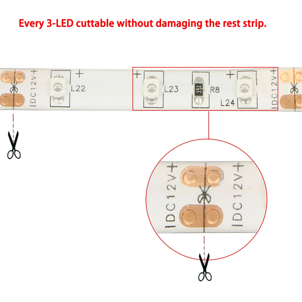 * 3. Каждые 3 светодиода можно разрезать, не повреждая остальные полоски, согласно вашему требованию.